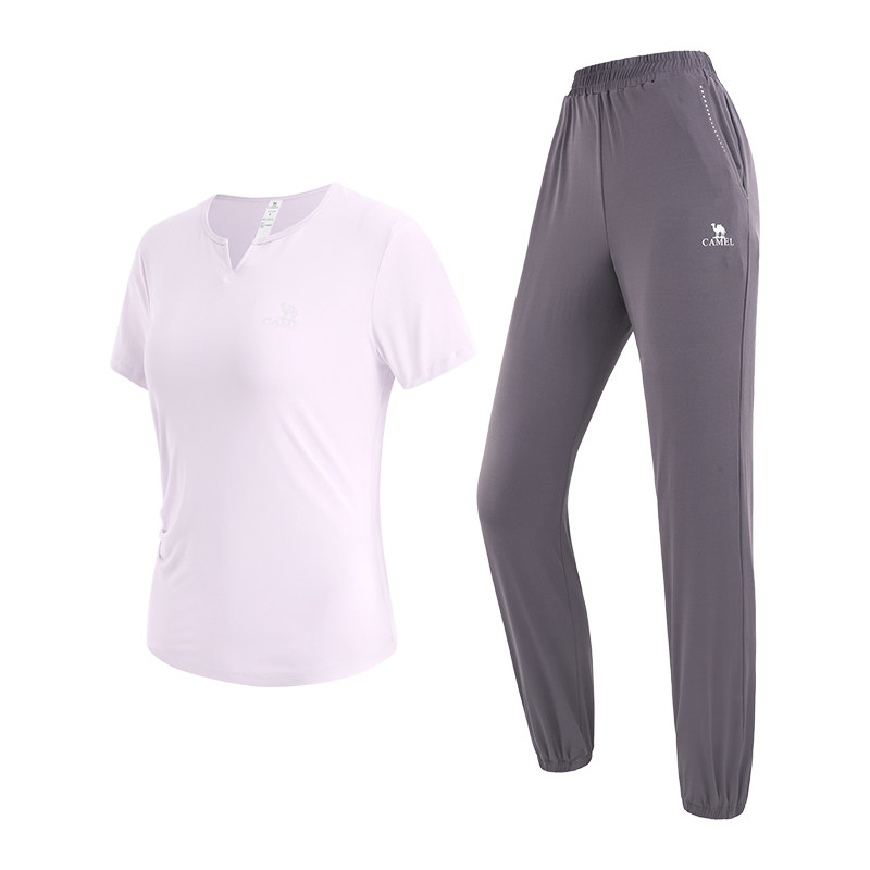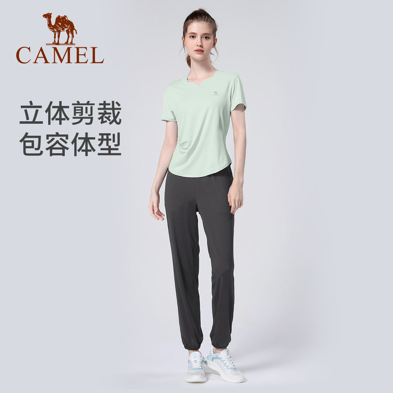 骆驼瑜伽服套装女夏季户外跑步服短袖运动服时尚专业健身服两件套