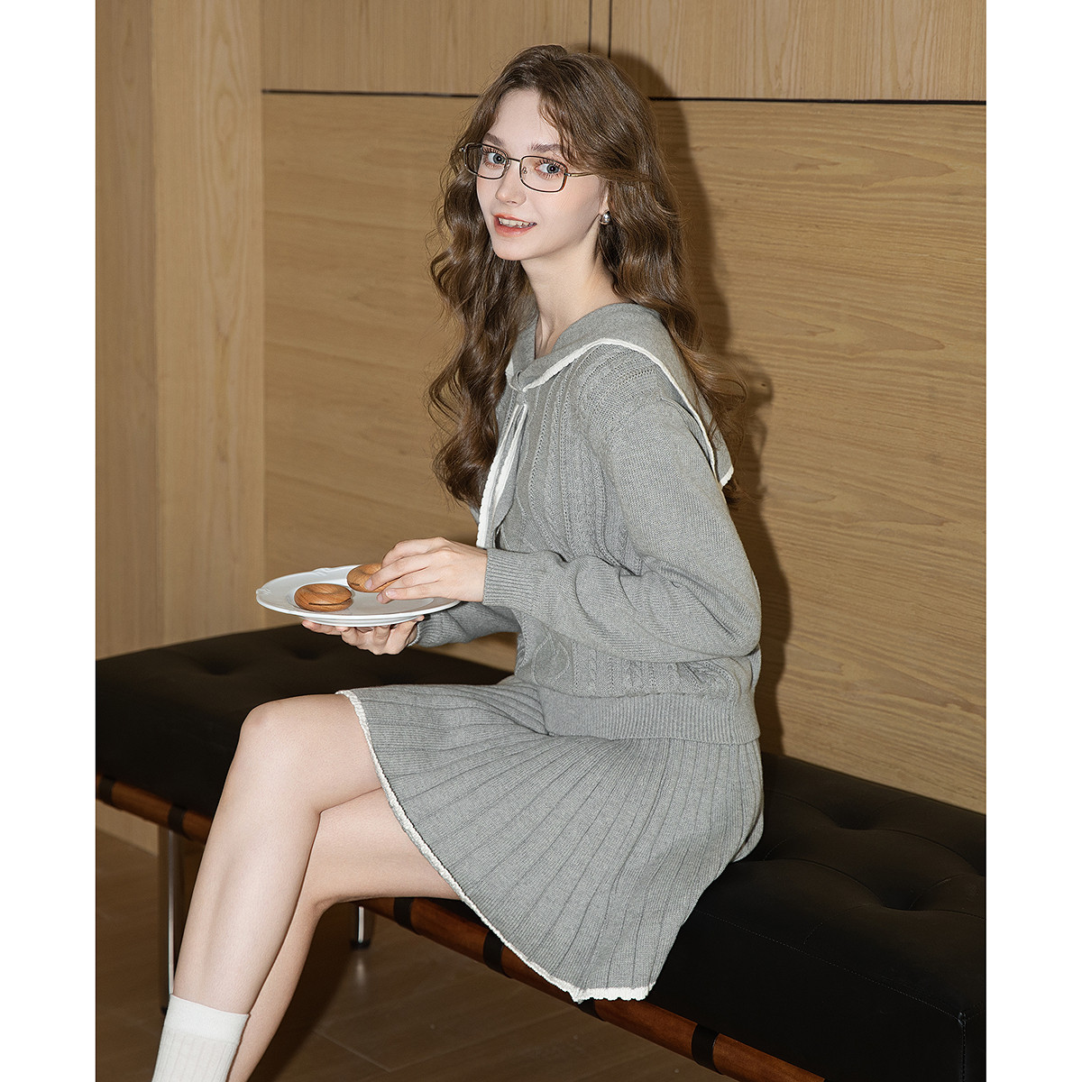 唐狮秋季短裙套装女毛织海军领绞花毛线衫休闲风简约百搭时尚TUTA