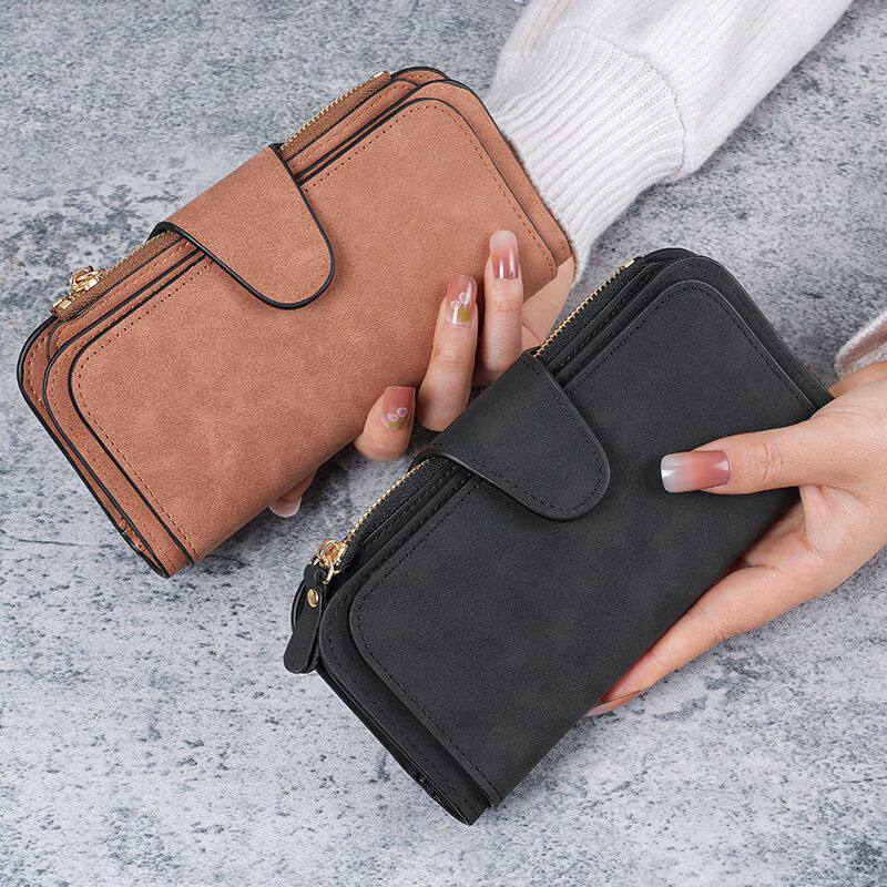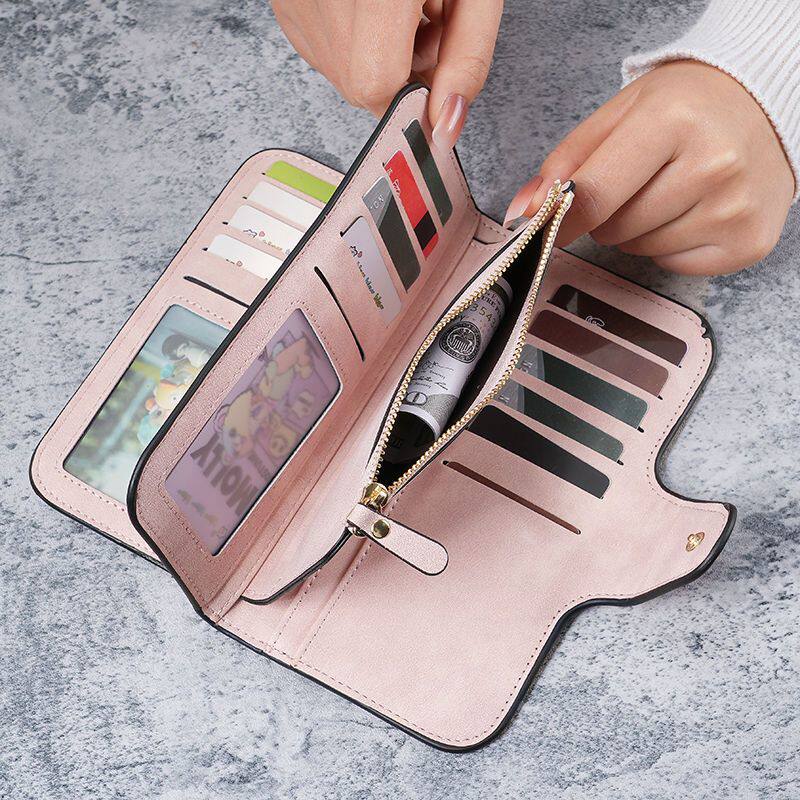 简约纯色钱包女长款拉链便携三折钱夹多卡位卡包大容量高档手拿包