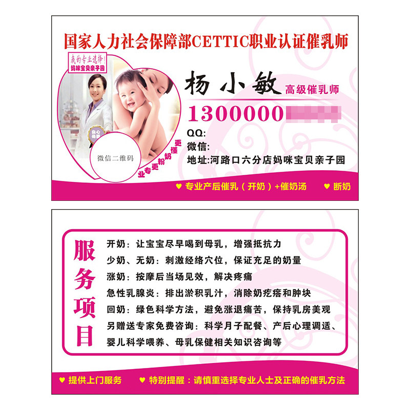 催乳师名片小儿推拿母乳母婴用品店月嫂产后修复设计定制做产后护
