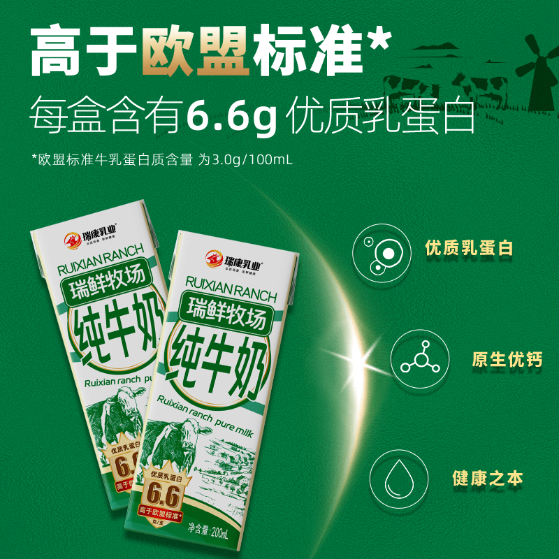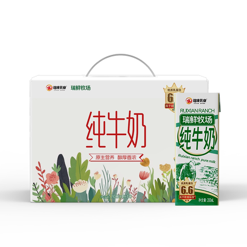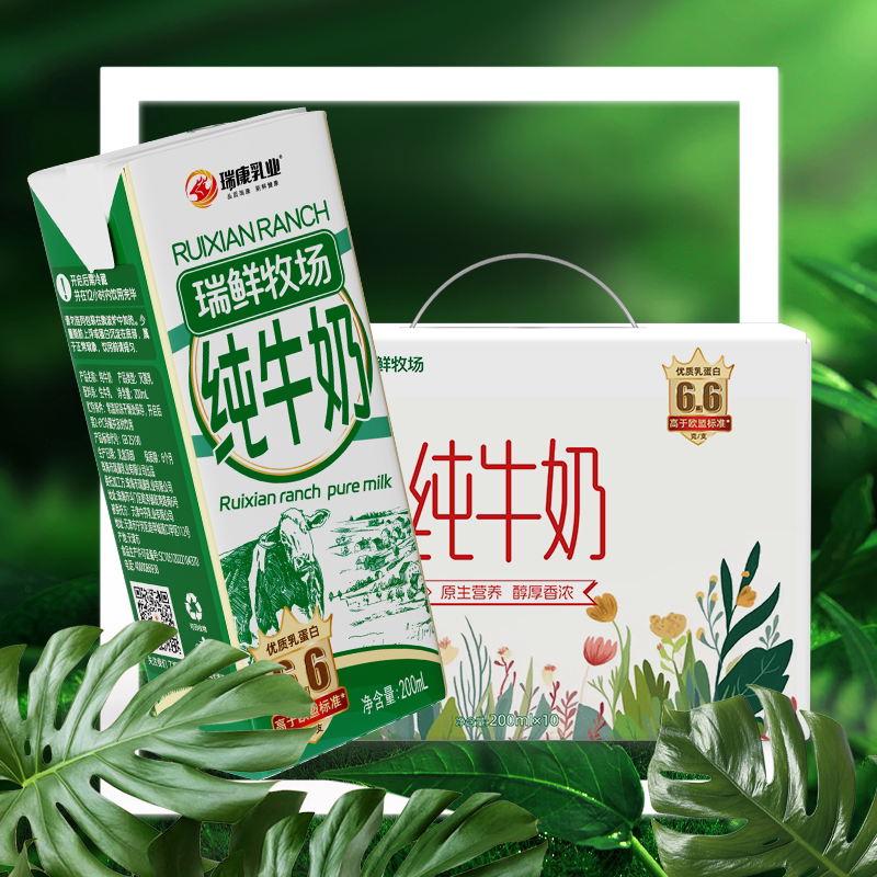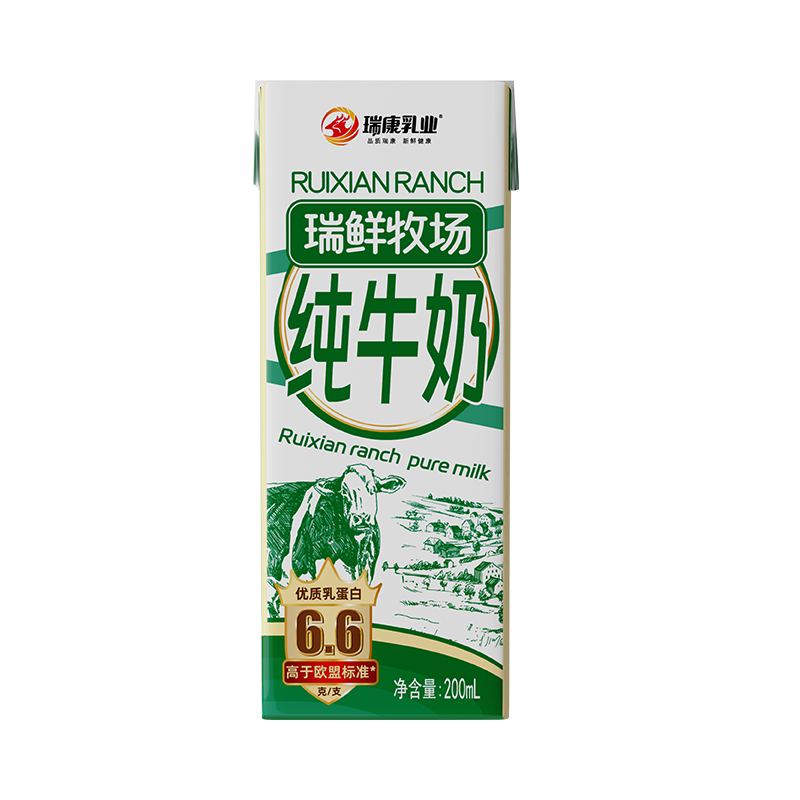瑞康纯牛奶6.6克优质200ml生牛乳学生家庭营养早餐新鲜盒装乳业