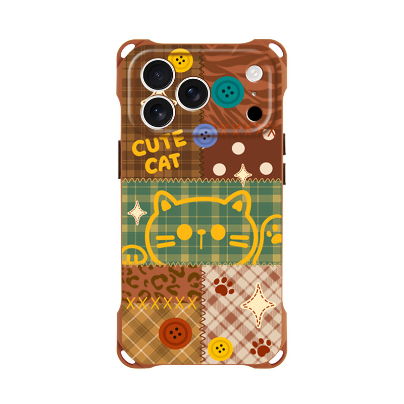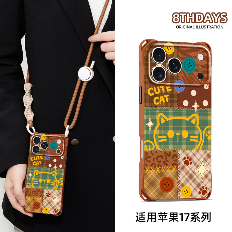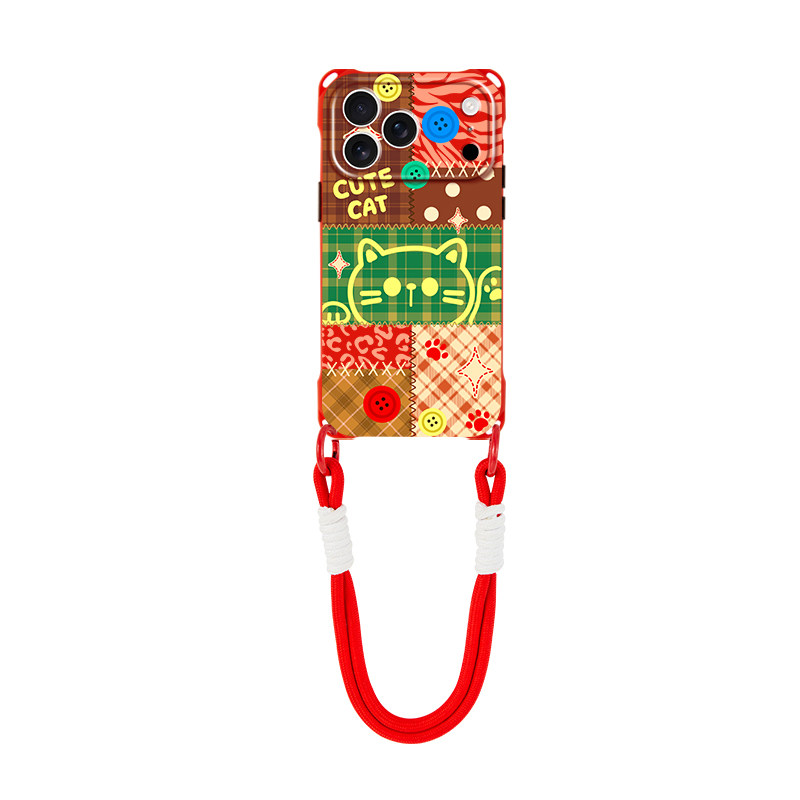 适用苹果17promax手机壳原创拼接格纹猫咪16plus挂绳斜挎15镜头全包华为pura80高级复古13红时尚秋冬小米15