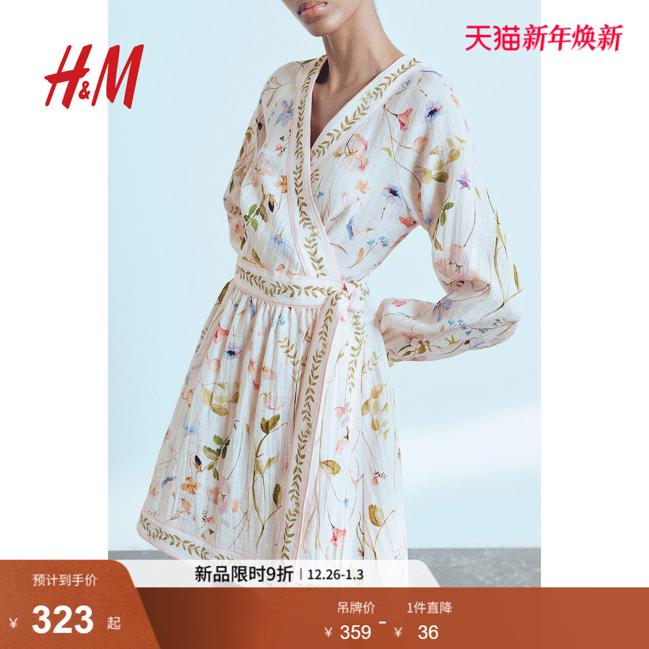 HM女装花卉连衣裙2025冬季新款V领收腰围裹式慵懒法式裙1265585