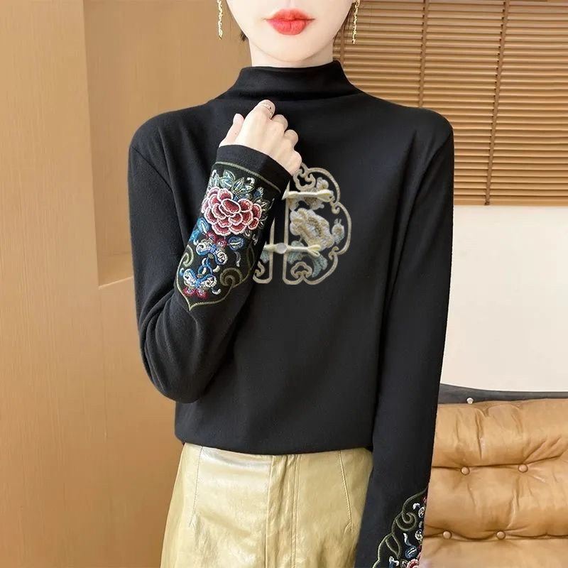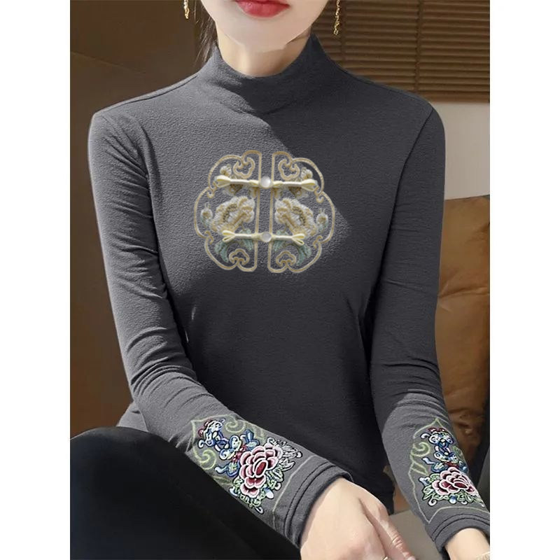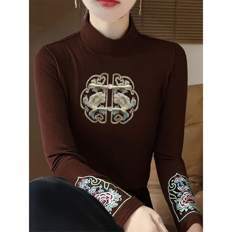 秋冬半高领德绒打底衫女复古民族风长袖中式T恤国风印花保暖上衣