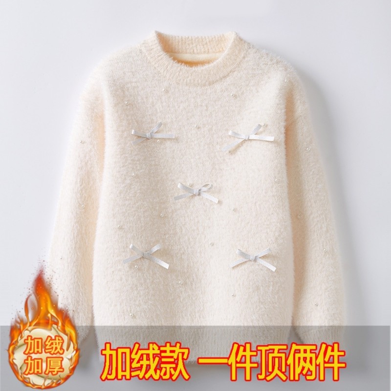 女童打底衫加绒厚毛衣秋冬装2025年水貂绒儿童针织衫上衣红色白色
