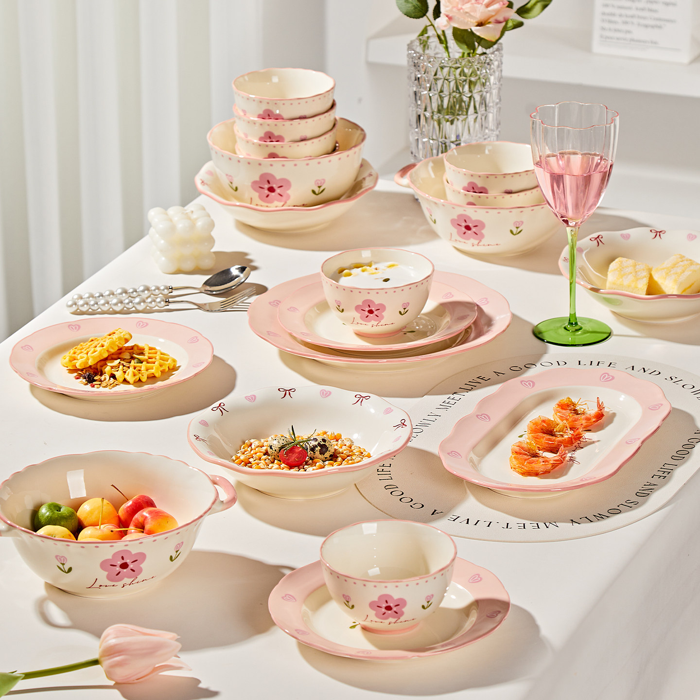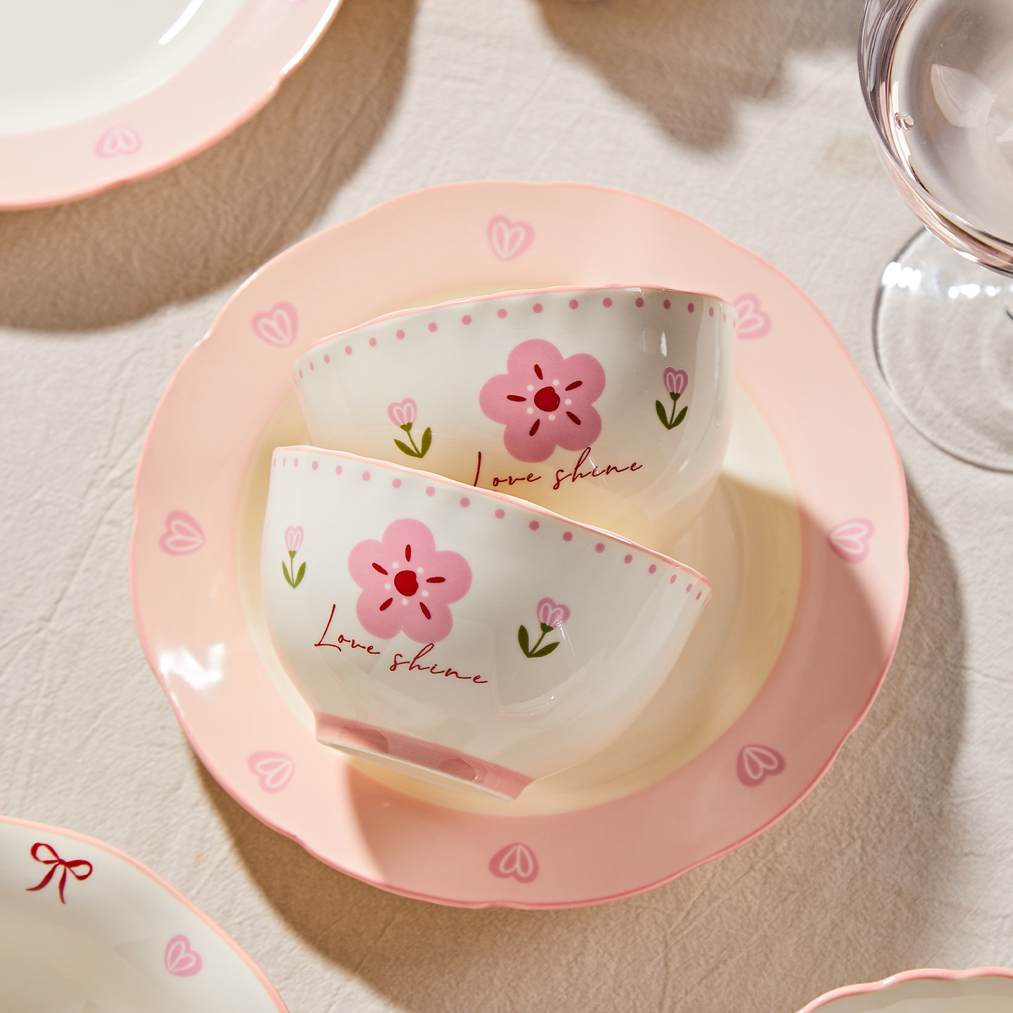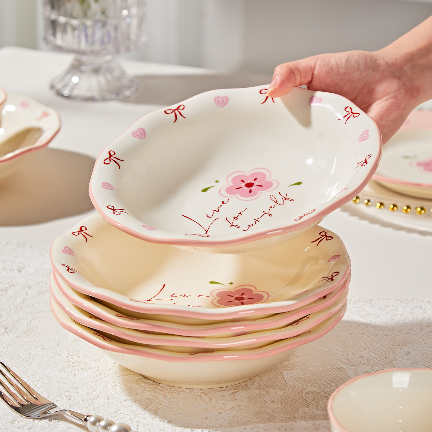 奶油风陶瓷碗家用卡通菜盘子可爱米饭碗汤碗釉下彩儿童餐具耐高温