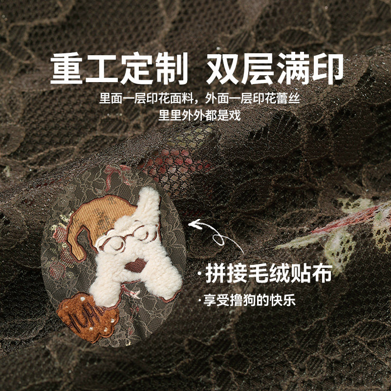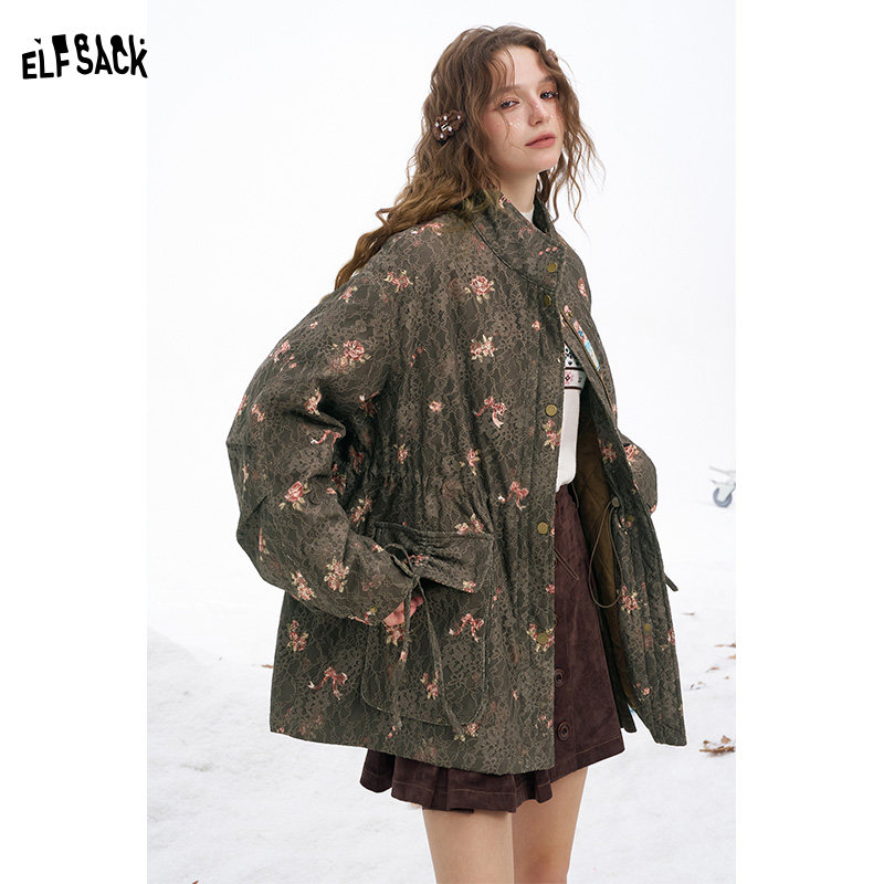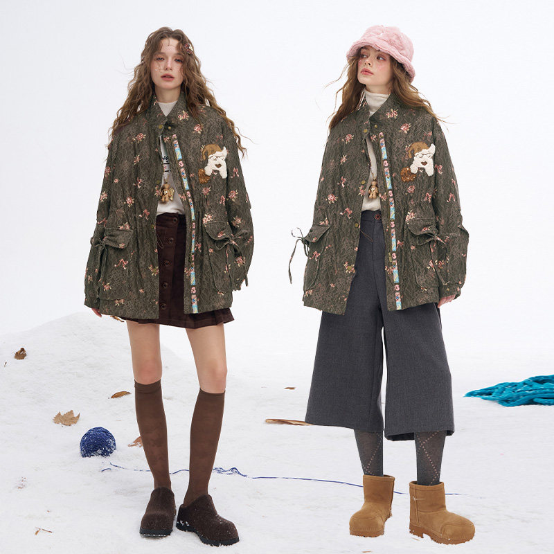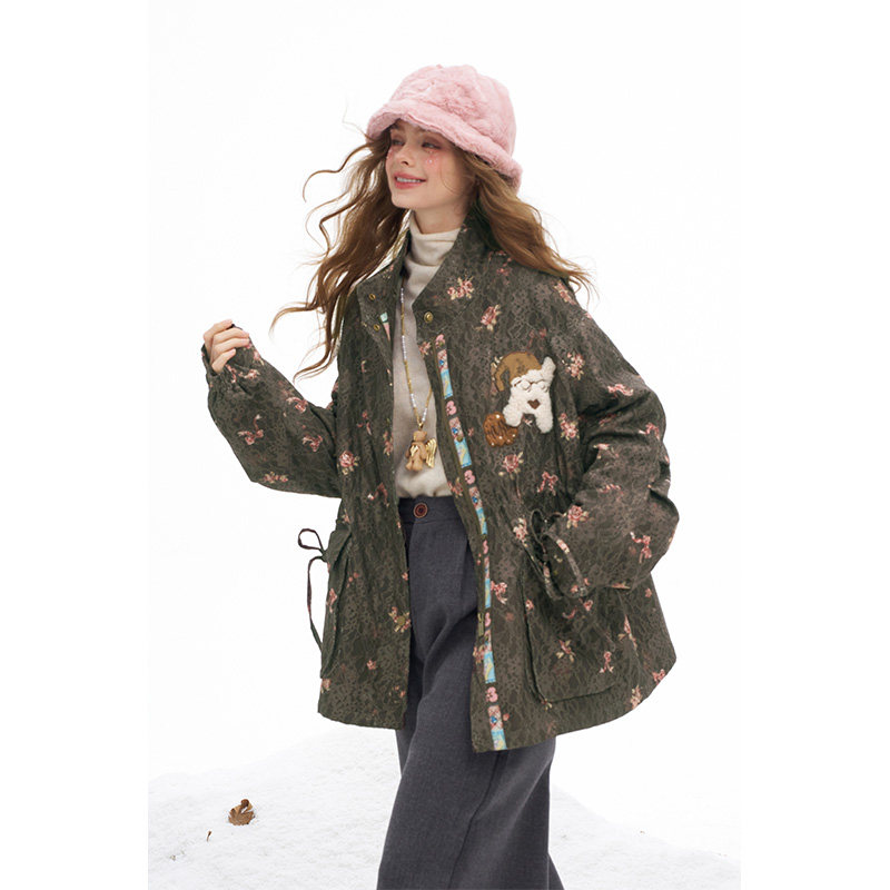 妖精的口袋原创满印重工蕾丝棉衣女2026年冬季新款夹棉派克服外套