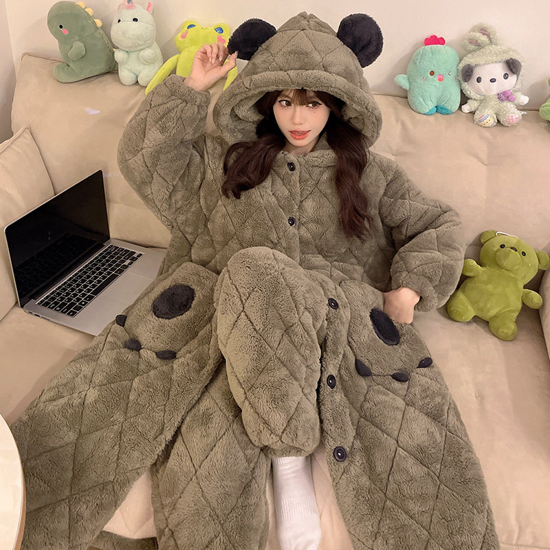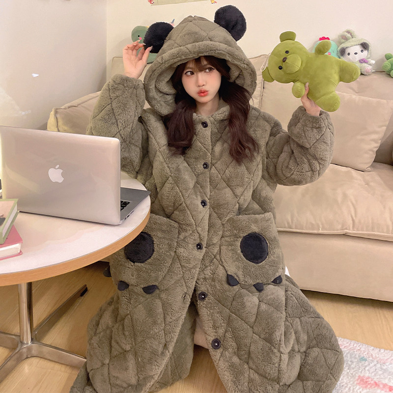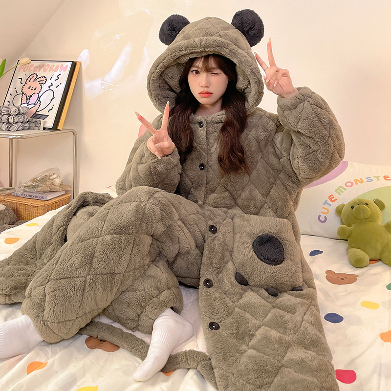 睡袍女秋冬季2025新款珊瑚绒三层夹棉加厚家居服女士大码睡衣套装