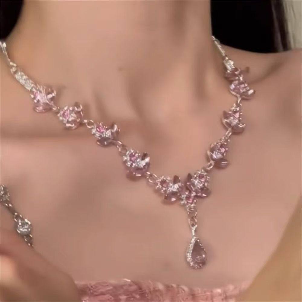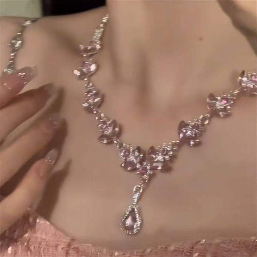 zoozmomo超闪粉色水滴锆石花朵项链女轻奢晚礼服锁骨链套装耳环潮
