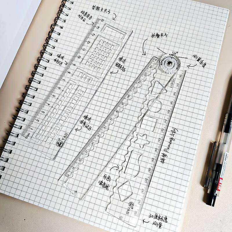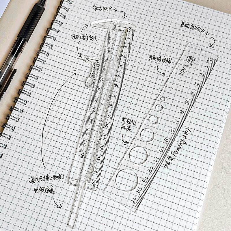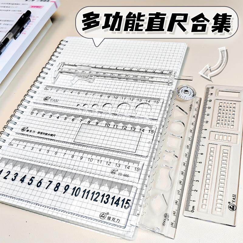 雅思办公绘图大数字放大镜折叠尺子15cm多功能刻度四件套透明直尺