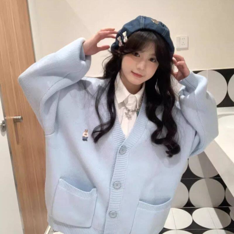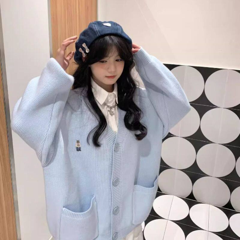 新款刺绣V领针织开衫女外套秋冬复古韩系大码内搭宽松慵懒风毛衣