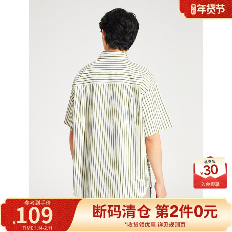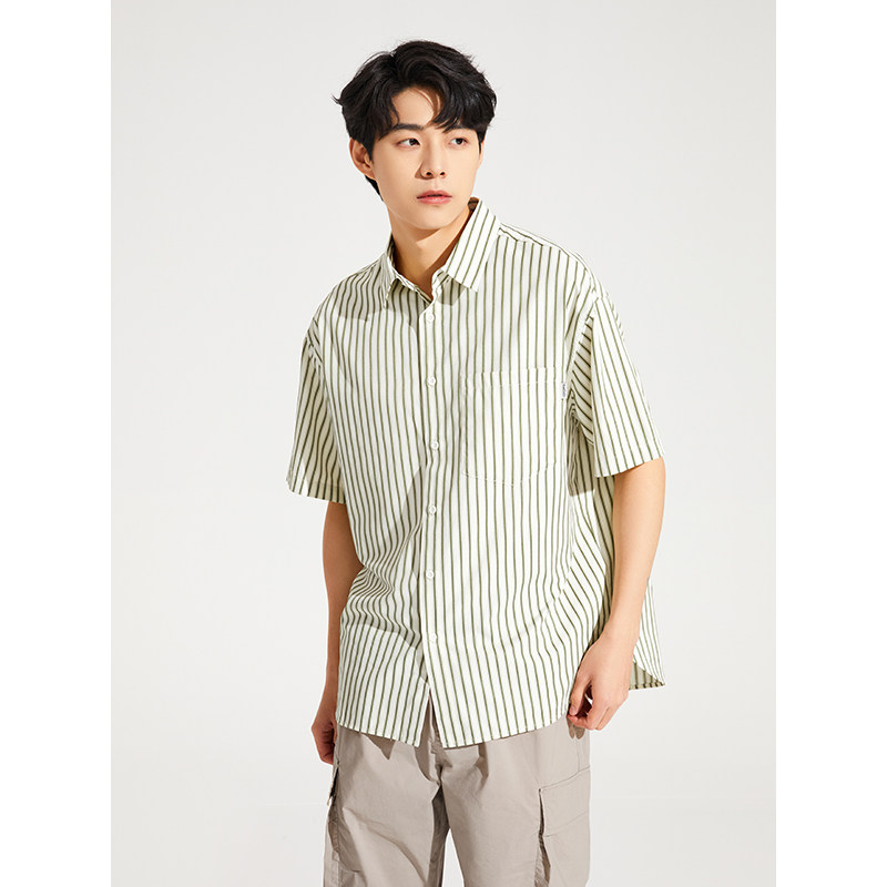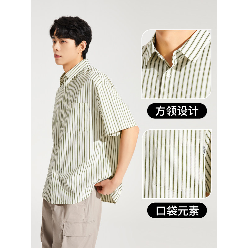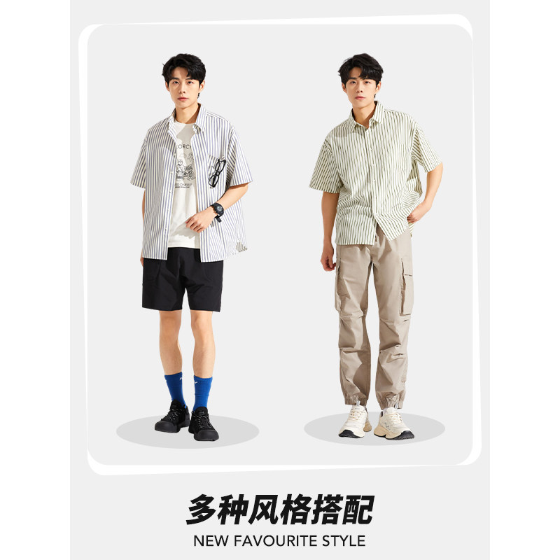 热风2024年夏季新款男士条纹宽松短袖衬衫休闲商务短衬时尚外套男