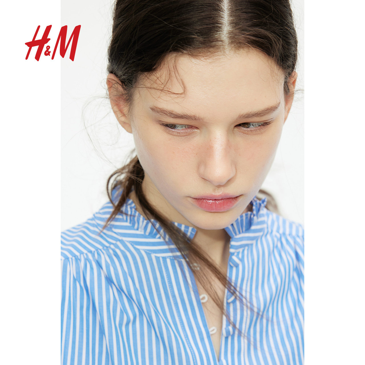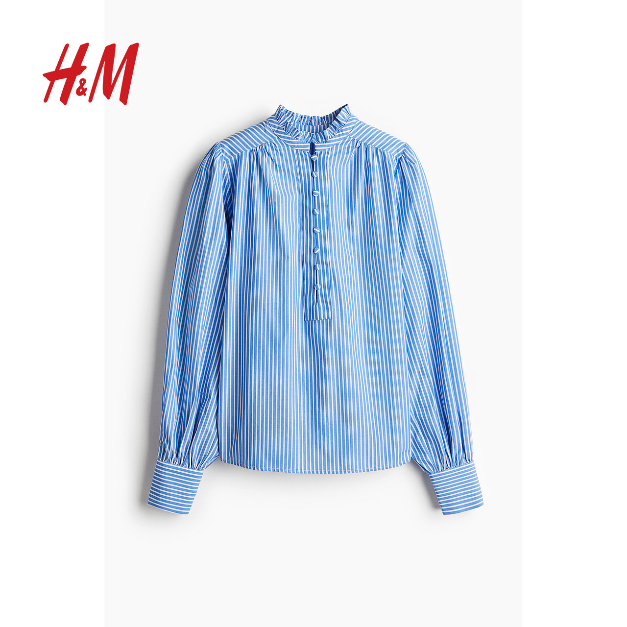 HM女装衬衫春季半开襟时尚通勤休闲褶皱领棉质花边衬衣衫1270106