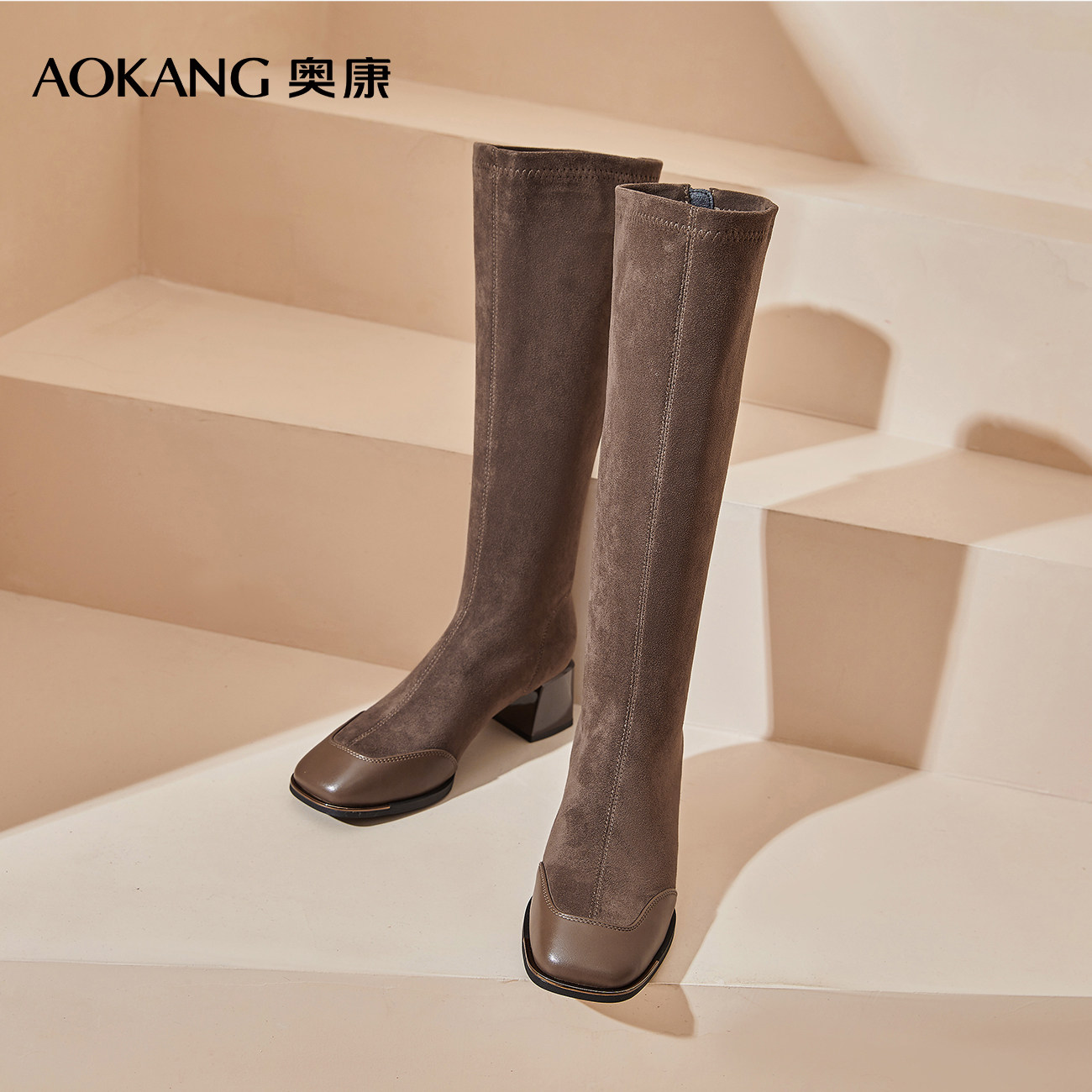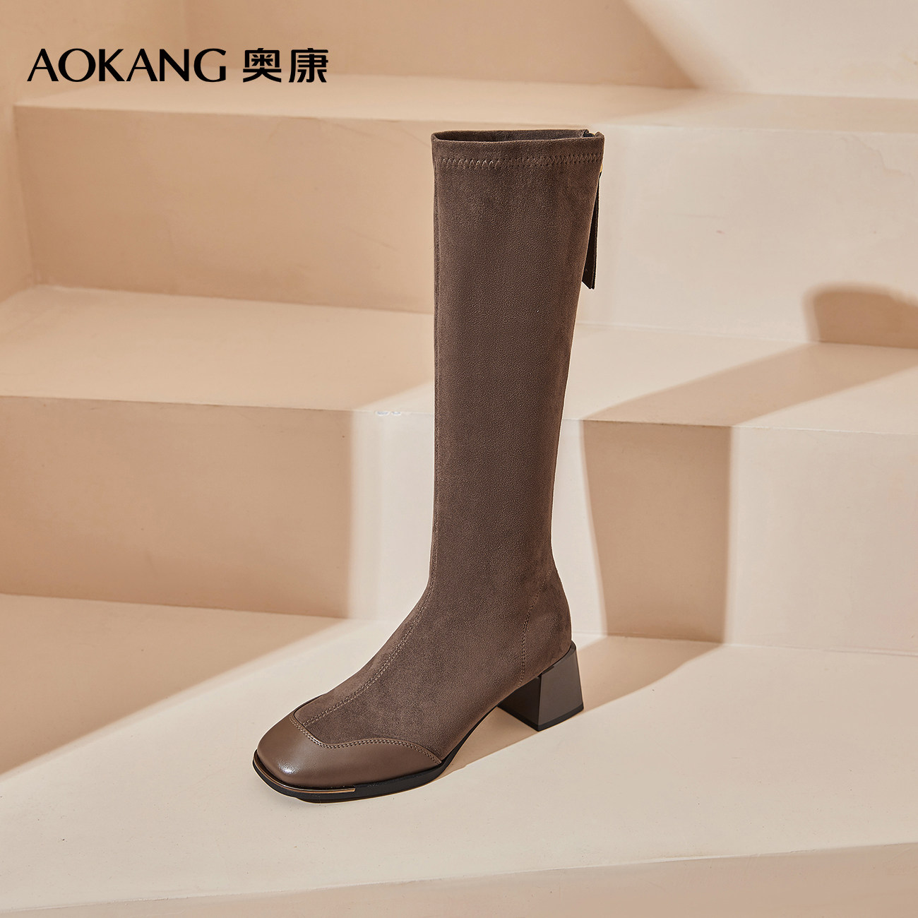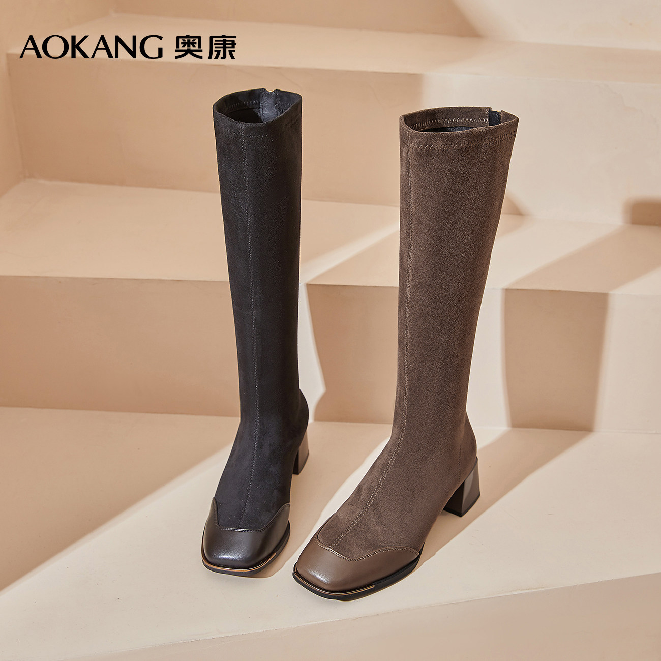 奥康 女鞋长筒靴女秋冬高跟高筒靴小个子绒面长靴