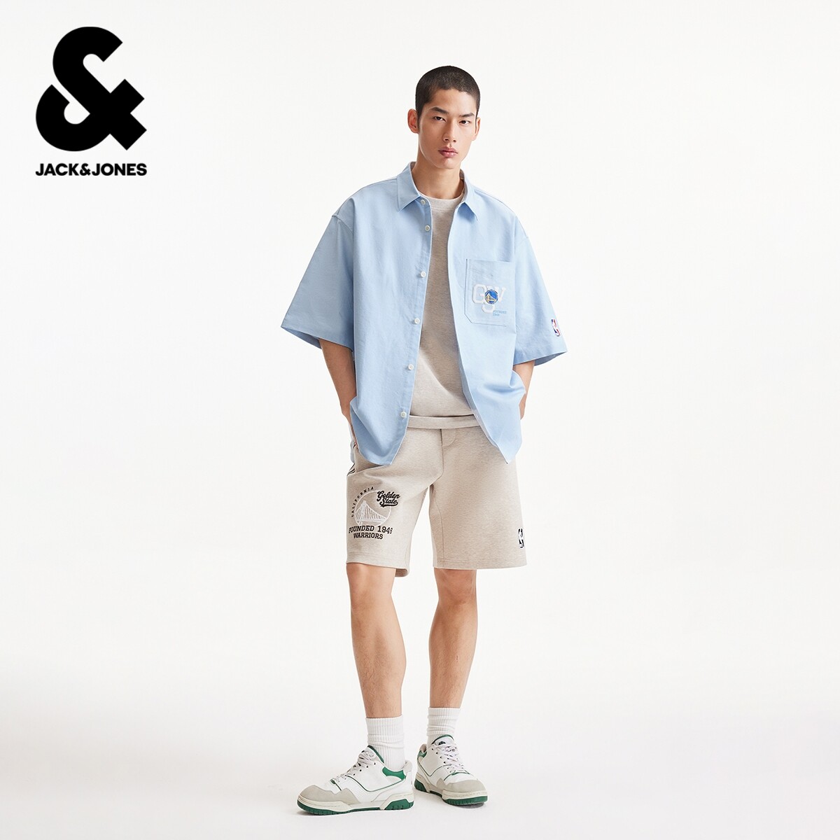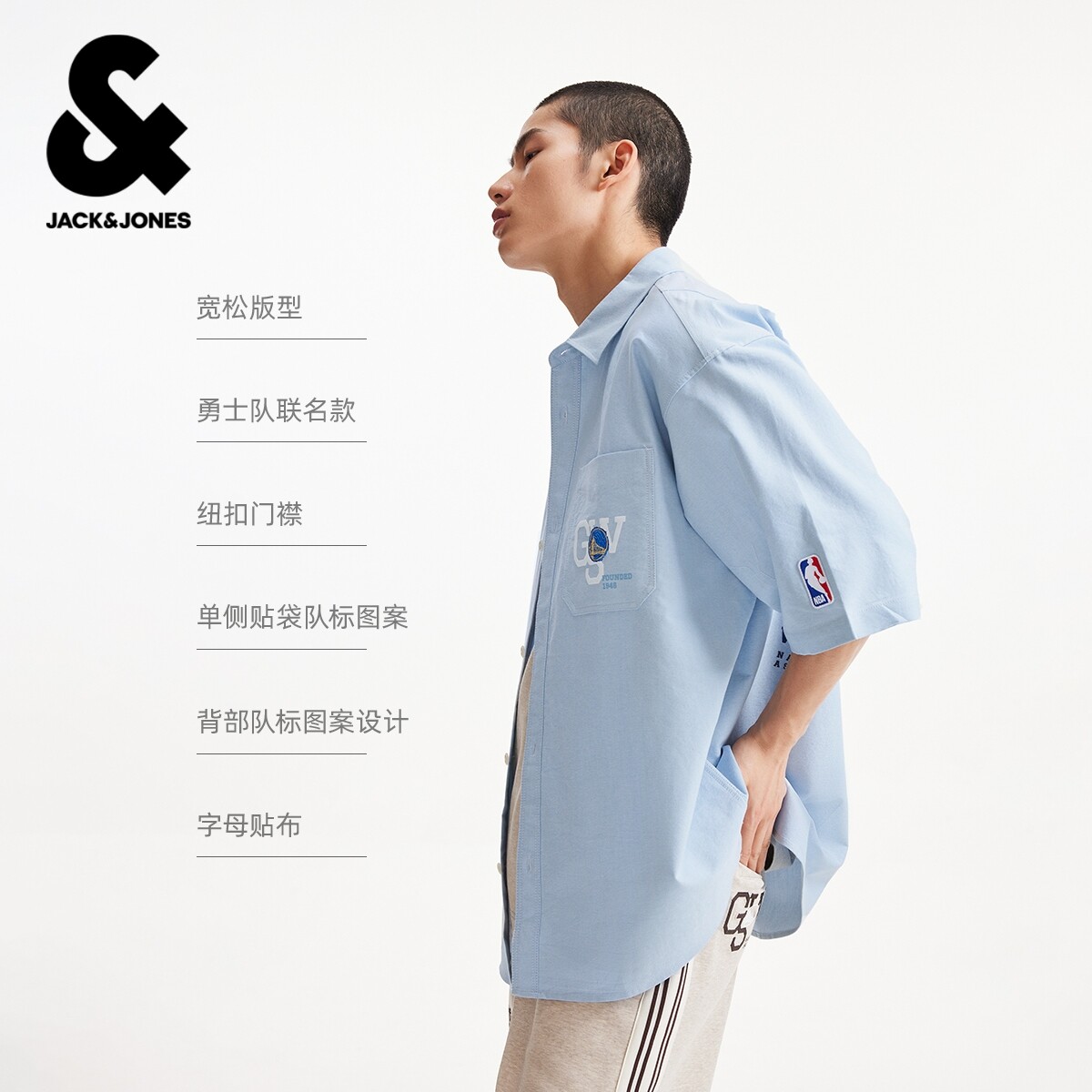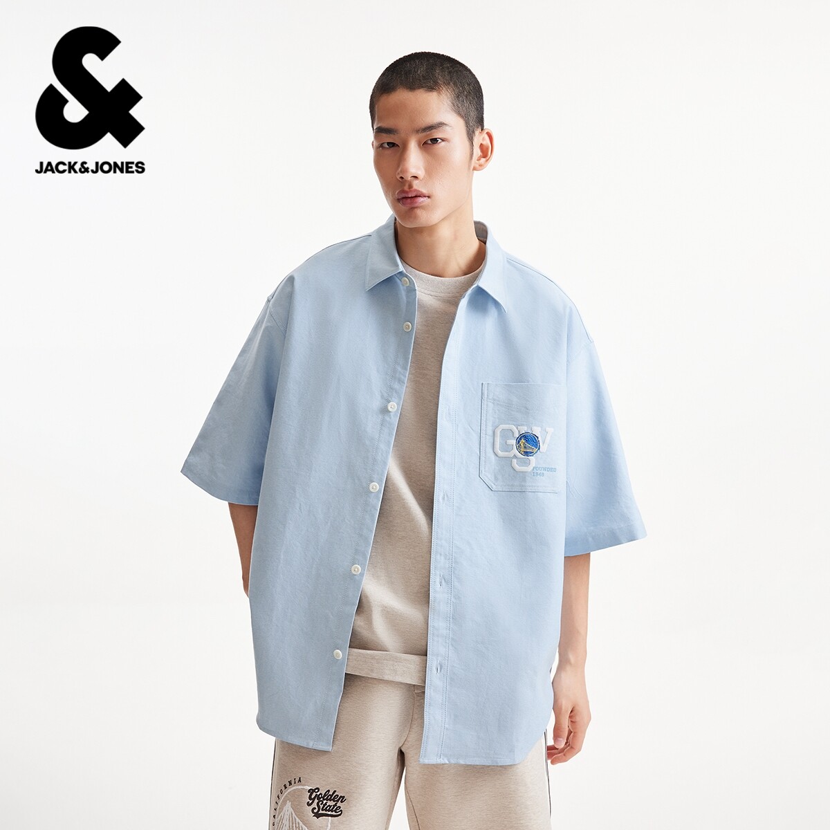 【NBA联名勇士队】杰克琼斯男短袖衬衫纯棉舒适图案装饰尖领宽松