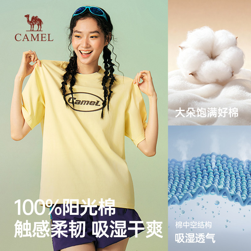 骆驼短袖女夏季2026新款上衣美式复古宽松时尚印花260g纯棉T恤女