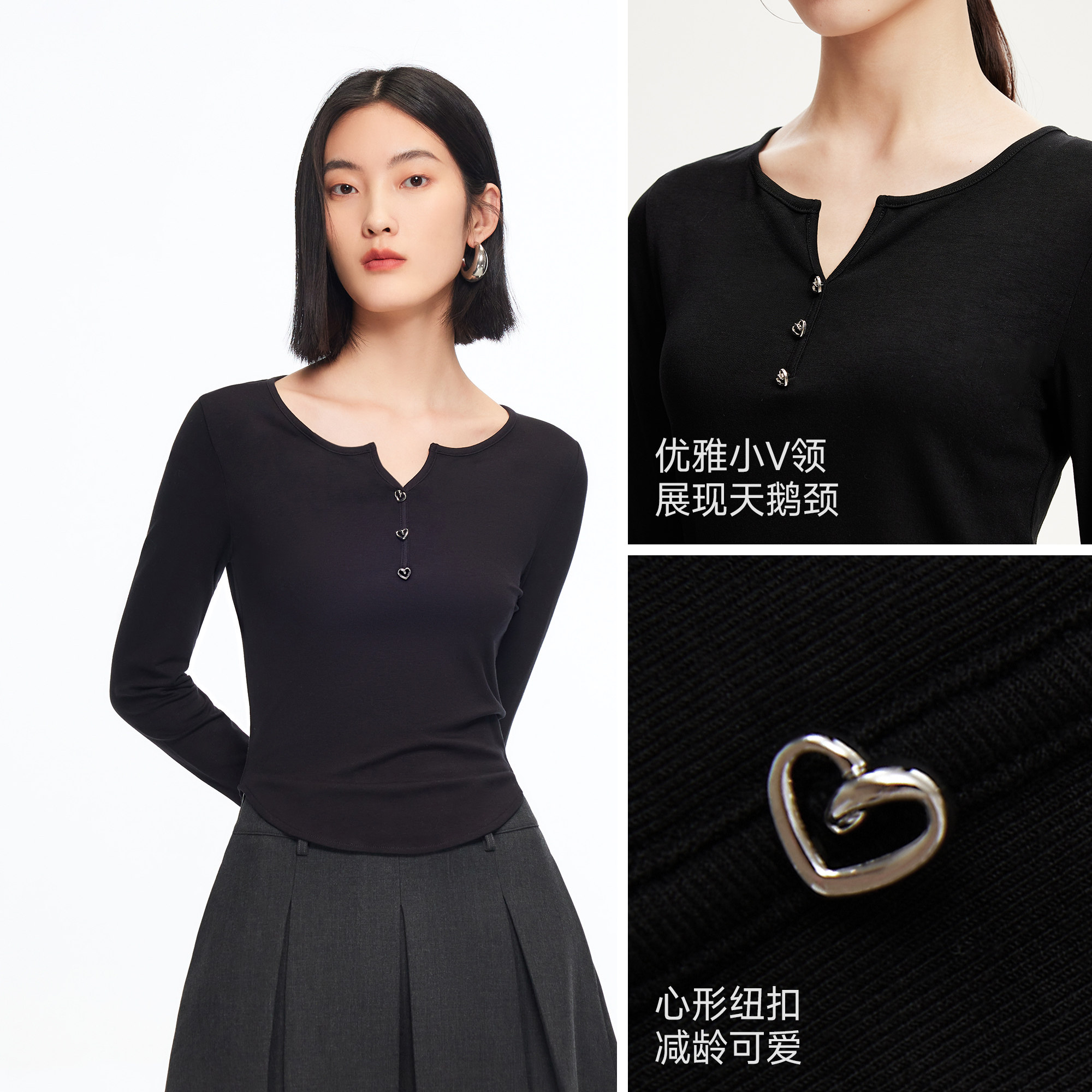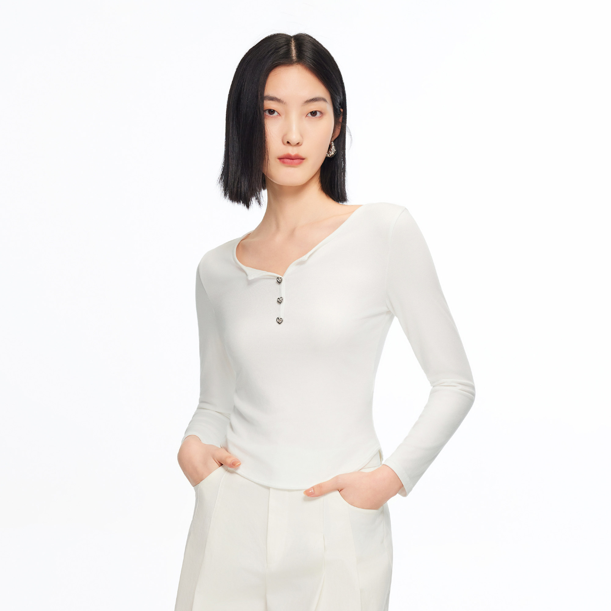 蕉下亨利衫女长袖T恤v领秋冬修身保暖低领打底衫半开领白色上衣