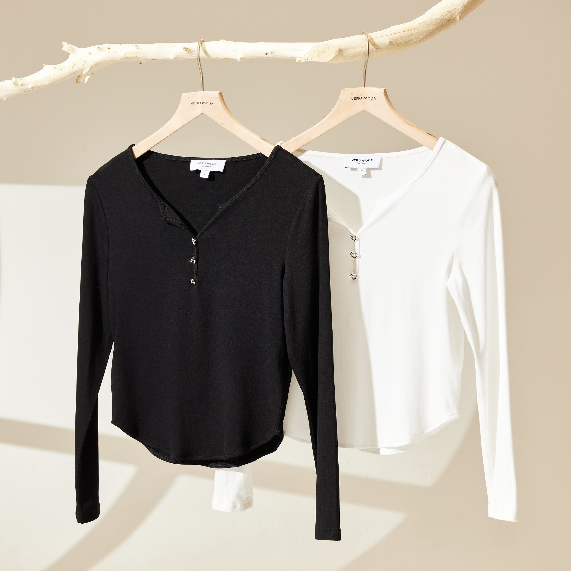 【热卖爆款】VeroModaT恤2026春季新款罗纹正肩V领长袖淑女风上衣