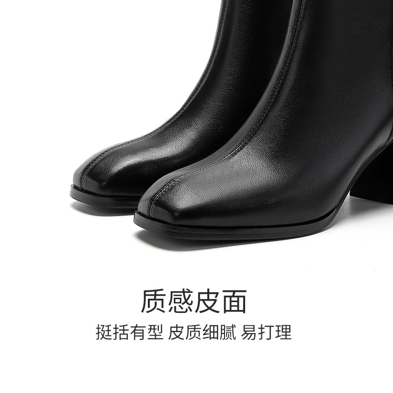 哈森方头粗跟短筒靴子女秋冬新款时尚通勤时装靴短靴HWA230110