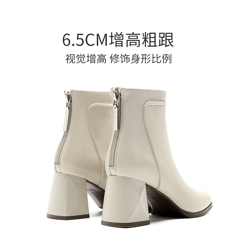 真皮白色高跟短靴女2025秋冬加绒保暖防滑增高粗跟瘦瘦软底马丁靴