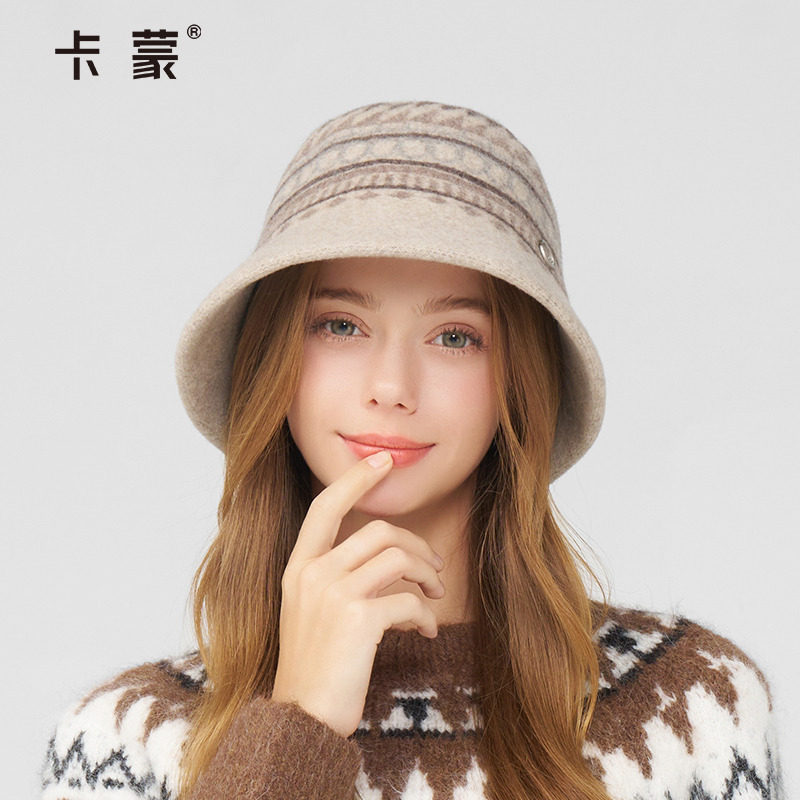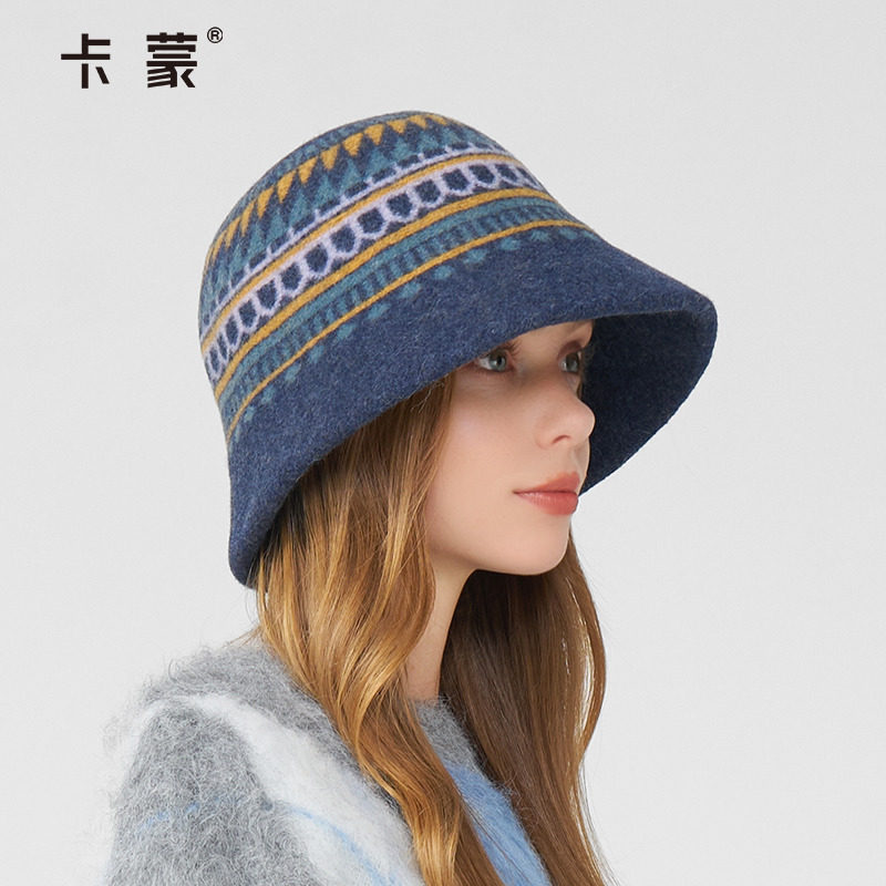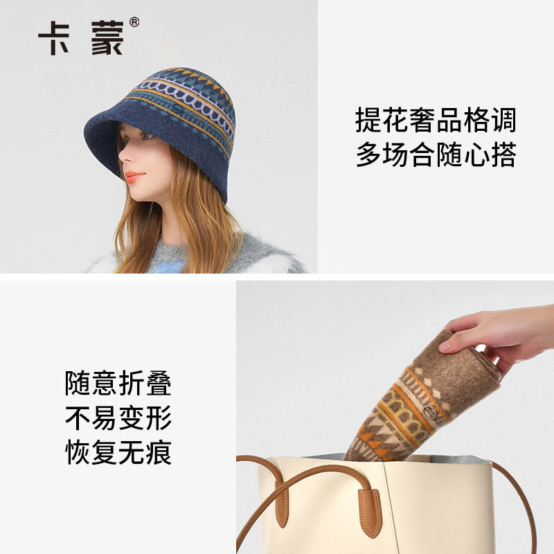 卡蒙100绵羊毛呢高端提花渔夫帽子女士秋冬小香风可折叠保暖盆帽