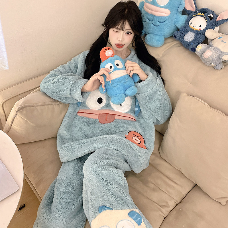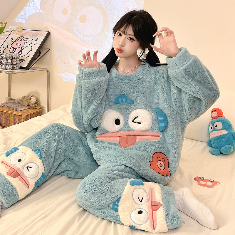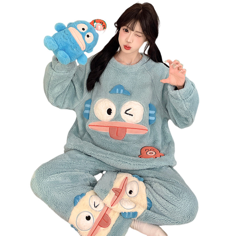可爱小丑鱼珊瑚绒睡衣女秋冬季保暖加厚加绒半边绒冬天家居服套装