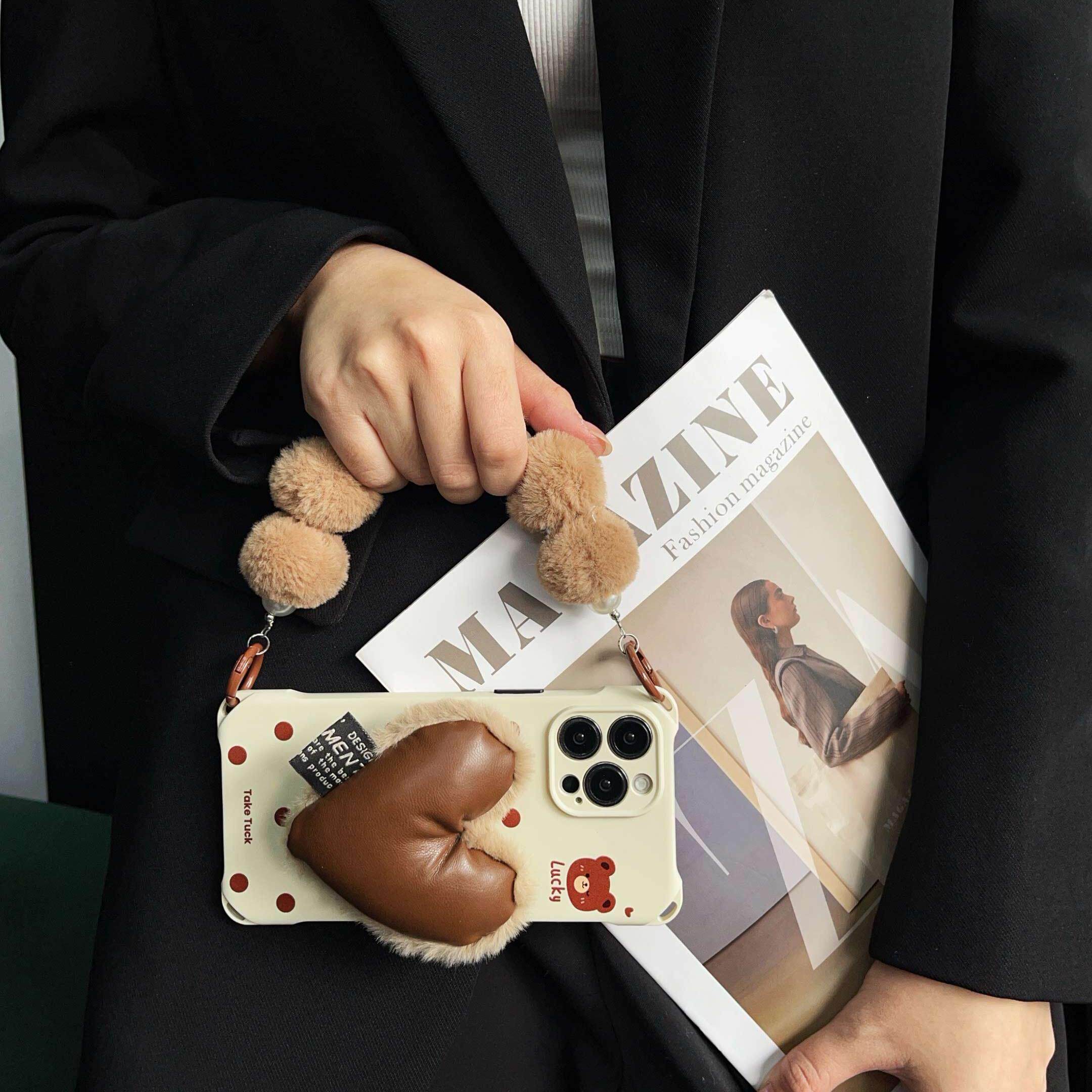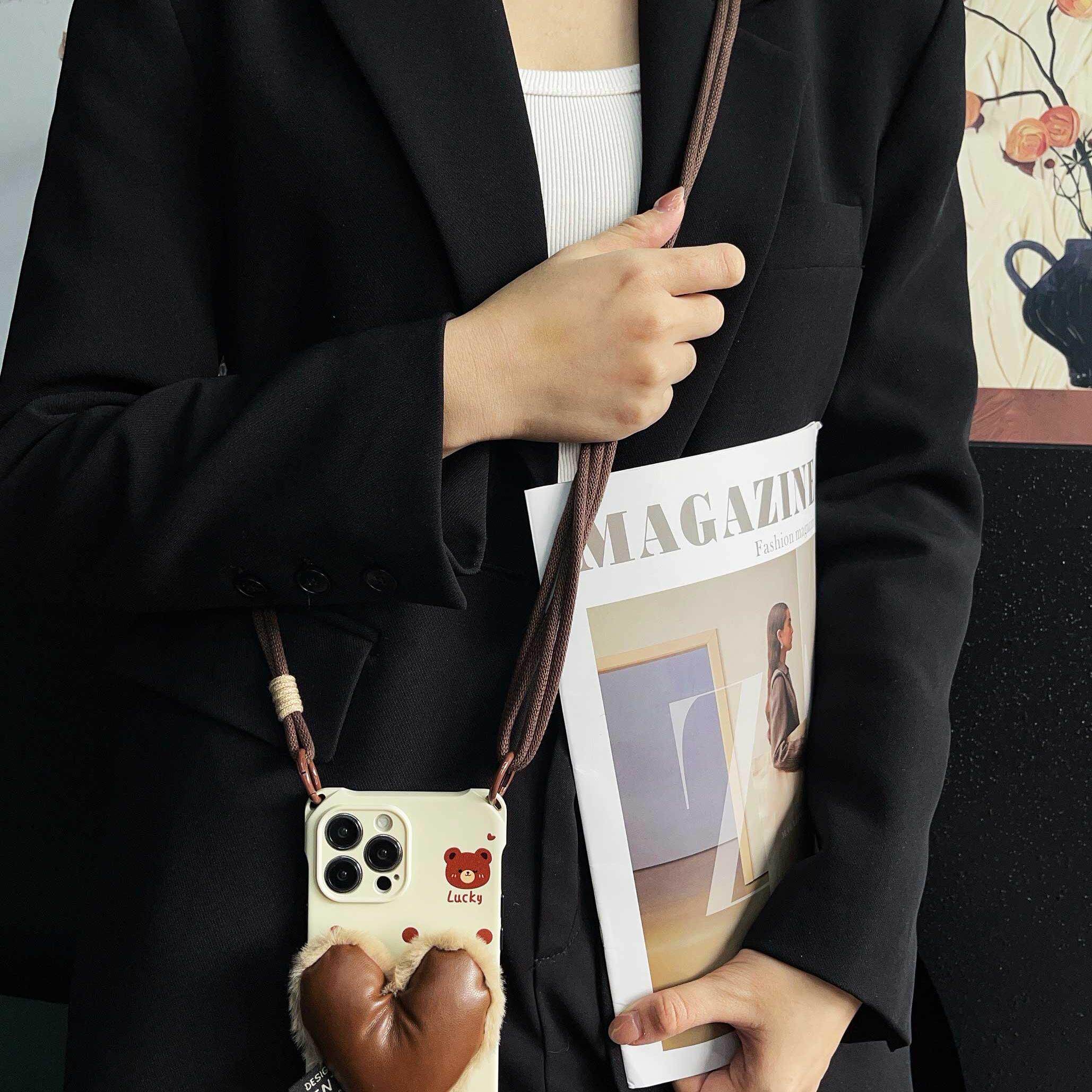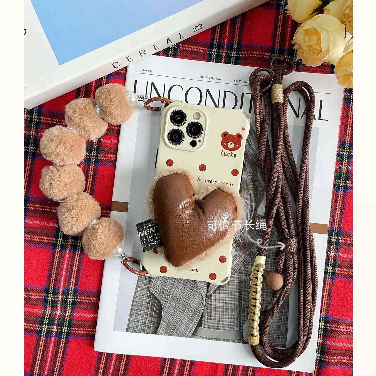 iphone16pro斜挎手机壳高级感14promax毛绒爱心支架适用苹果13小熊古董白编织旅游挂绳mate60pro软硅胶高级感