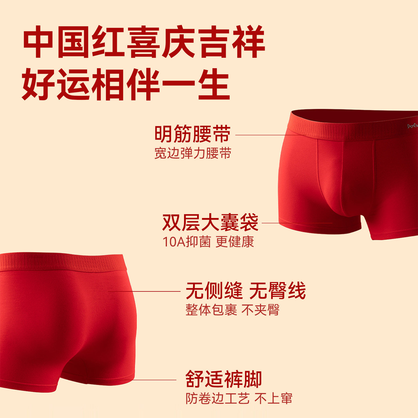 猫人新款本命年男士红色平角内裤四角裤头新婚礼物桑蚕丝抑菌底裆