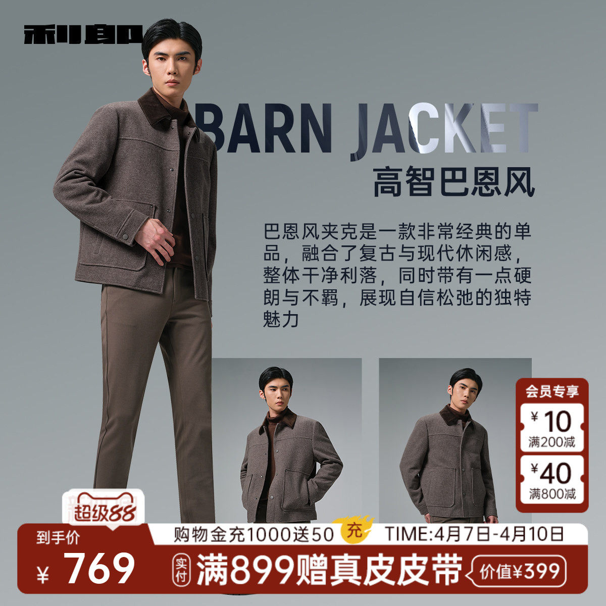 【巴恩风】利郎毛呢大衣男士短款羊毛夹克撞色翻领冬季男装外套