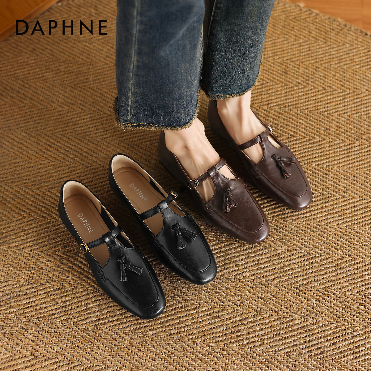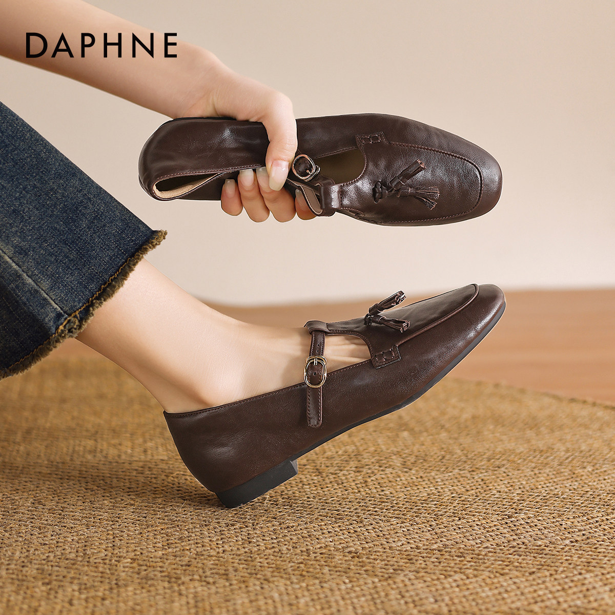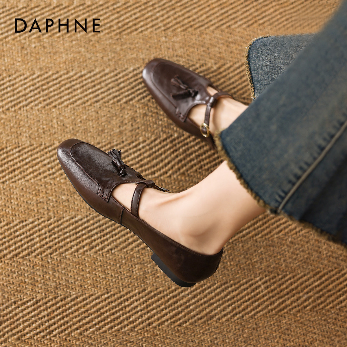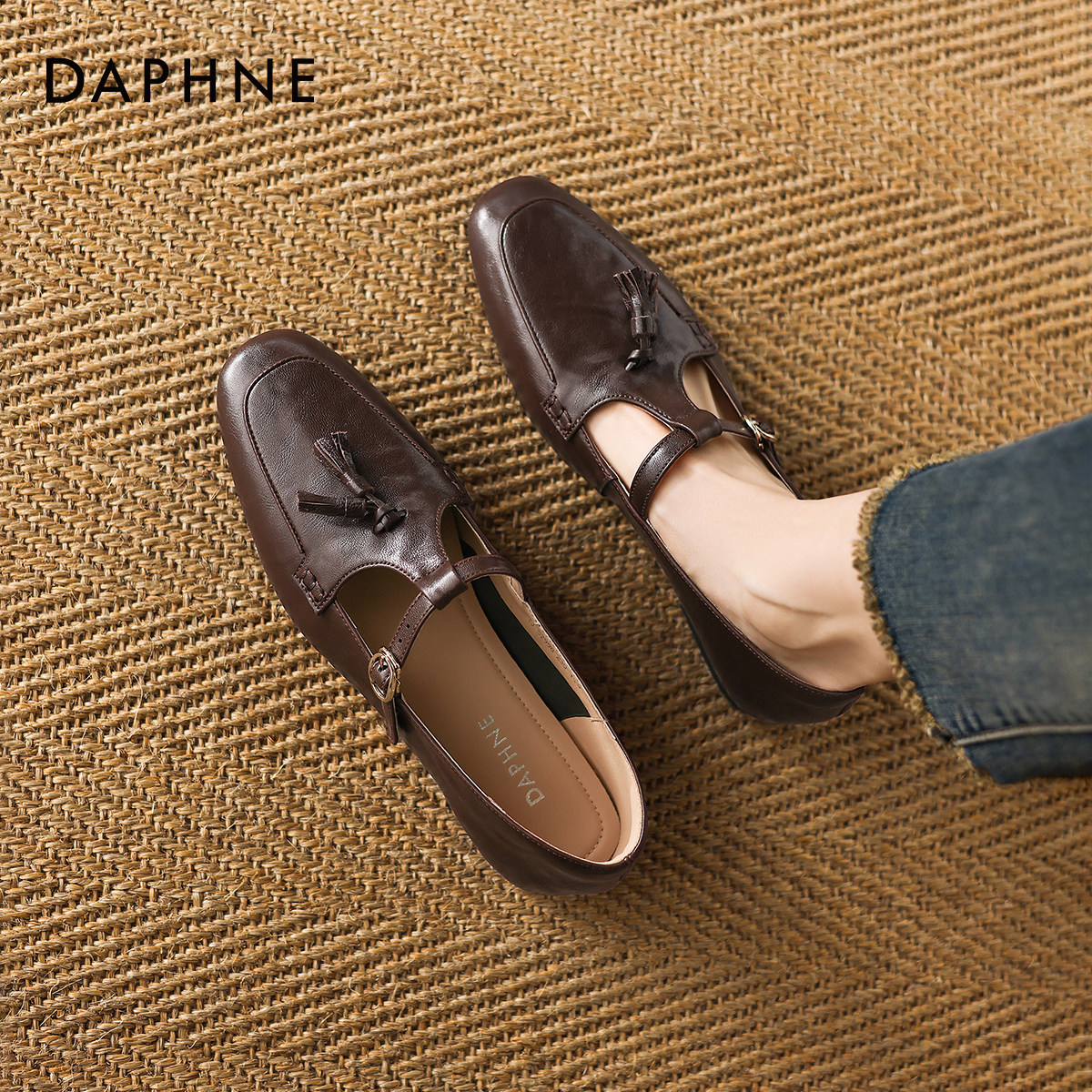 达芙妮棕色乐福鞋女款平底单鞋2026新款女士通勤小皮鞋豆豆女鞋子