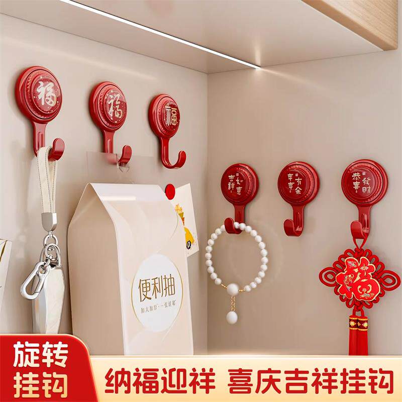 喜庆福字旋转挂钩免打孔强力承重粘胶入户门红色粘钩粘贴墙面厨房