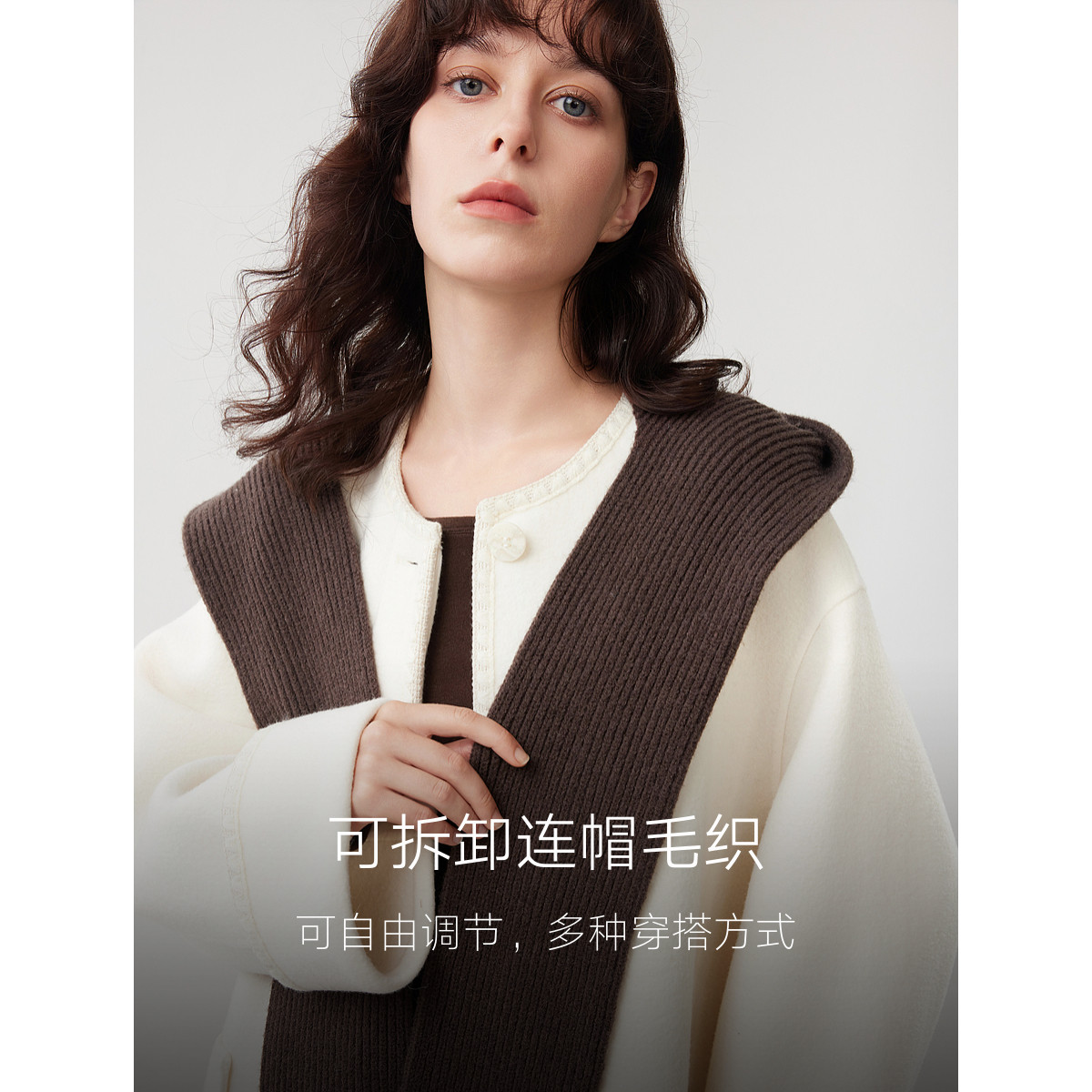 【空白画布】ELLE法式连帽绵羊毛双面呢大衣女25冬季新款毛呢外套