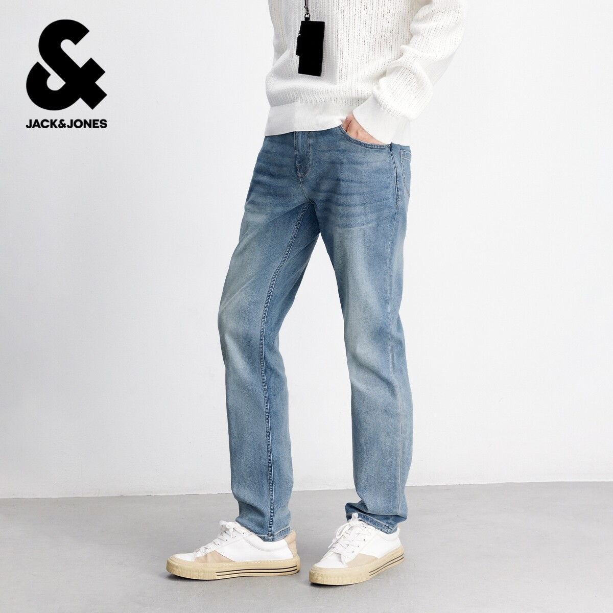杰克琼斯男装牛仔裤春季新款百搭时尚水洗猫须弹力合体直筒裤子