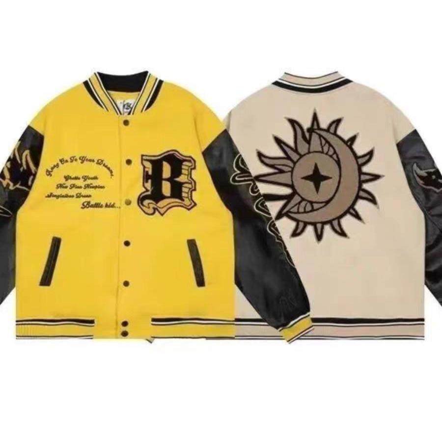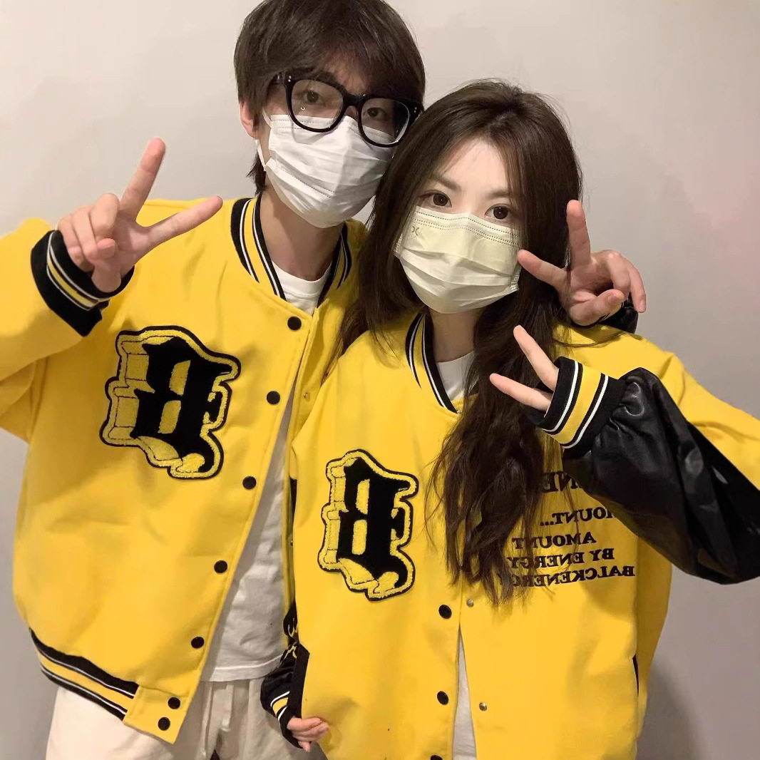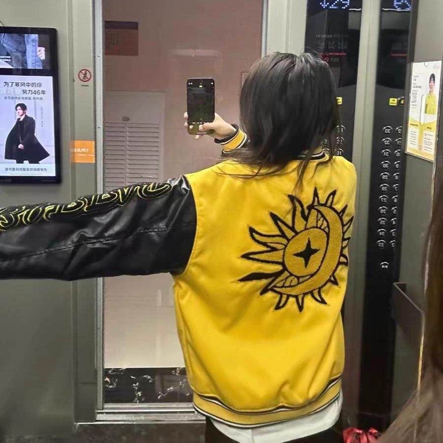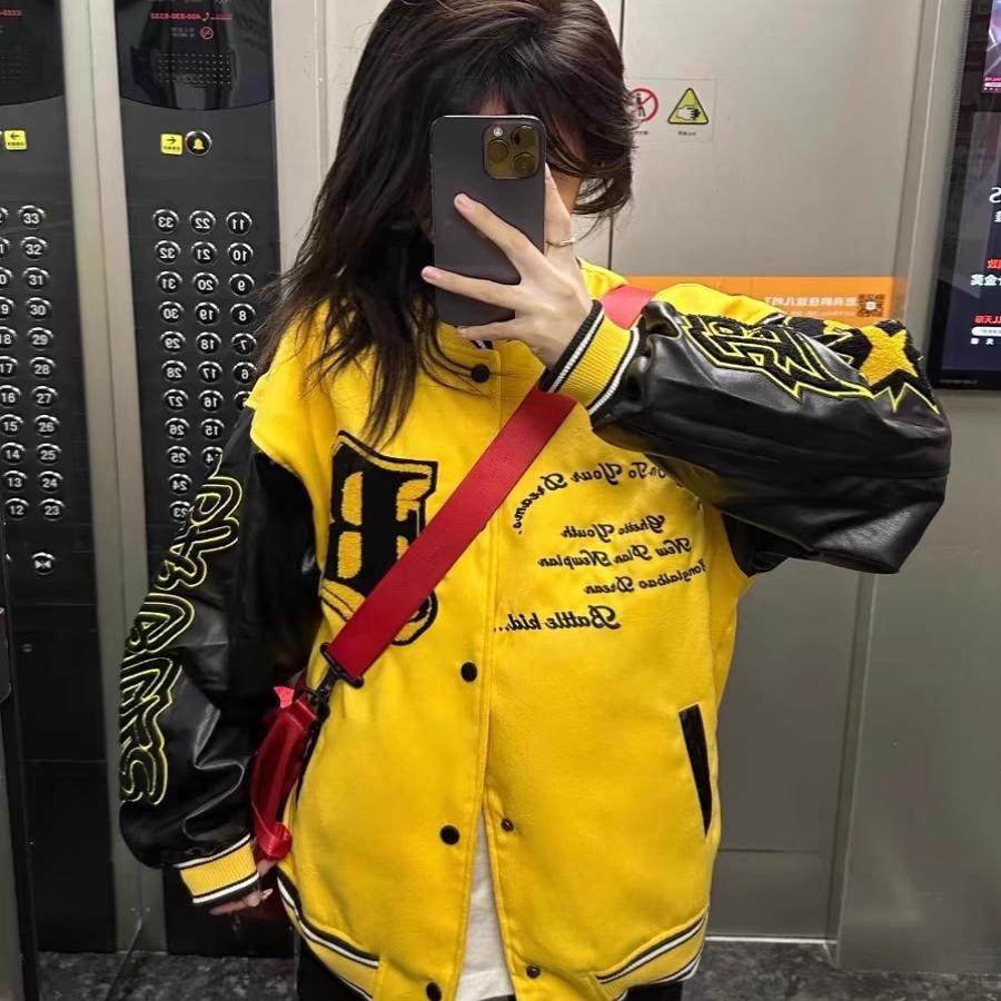 春秋欧美高街男女字母刺绣火焰夹克情侣黄色棒球服百搭拼色外套潮