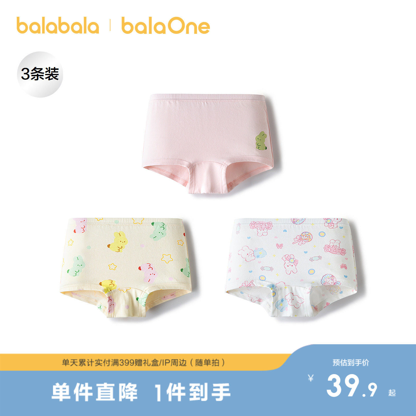 巴拉巴拉宝宝内裤平角纯棉裆儿童四角短裤小童女童短裤子萌三条装