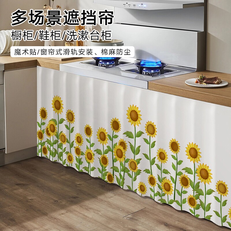 橱柜遮挡帘免打孔滑轨款厨房柜子衣架遮挡布防水遮丑隔断窗帘帘子