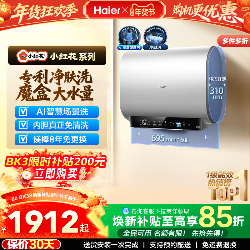 海尔小红花套系官方电热水器扁桶双胆家用洗澡速热一级魔盒BK3S