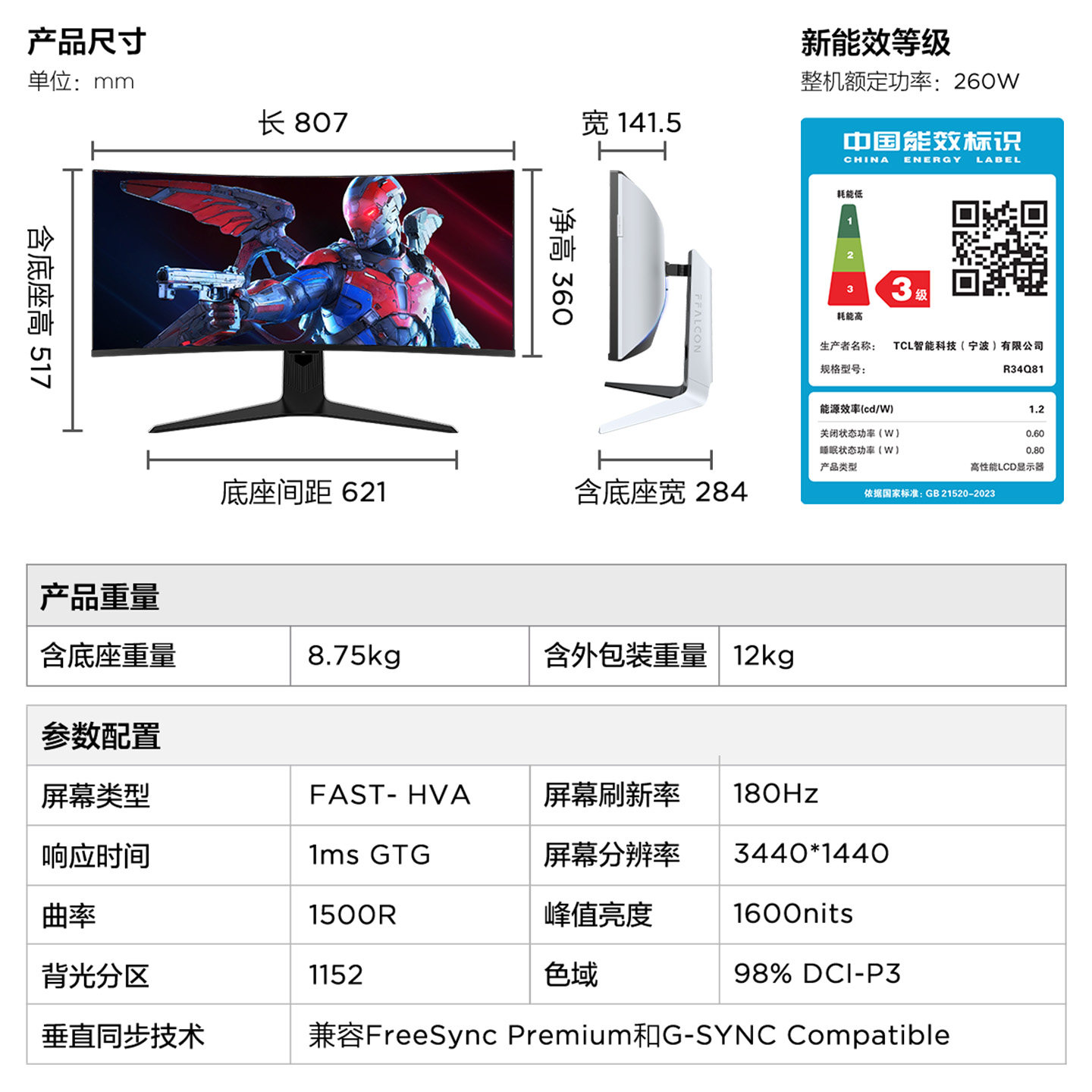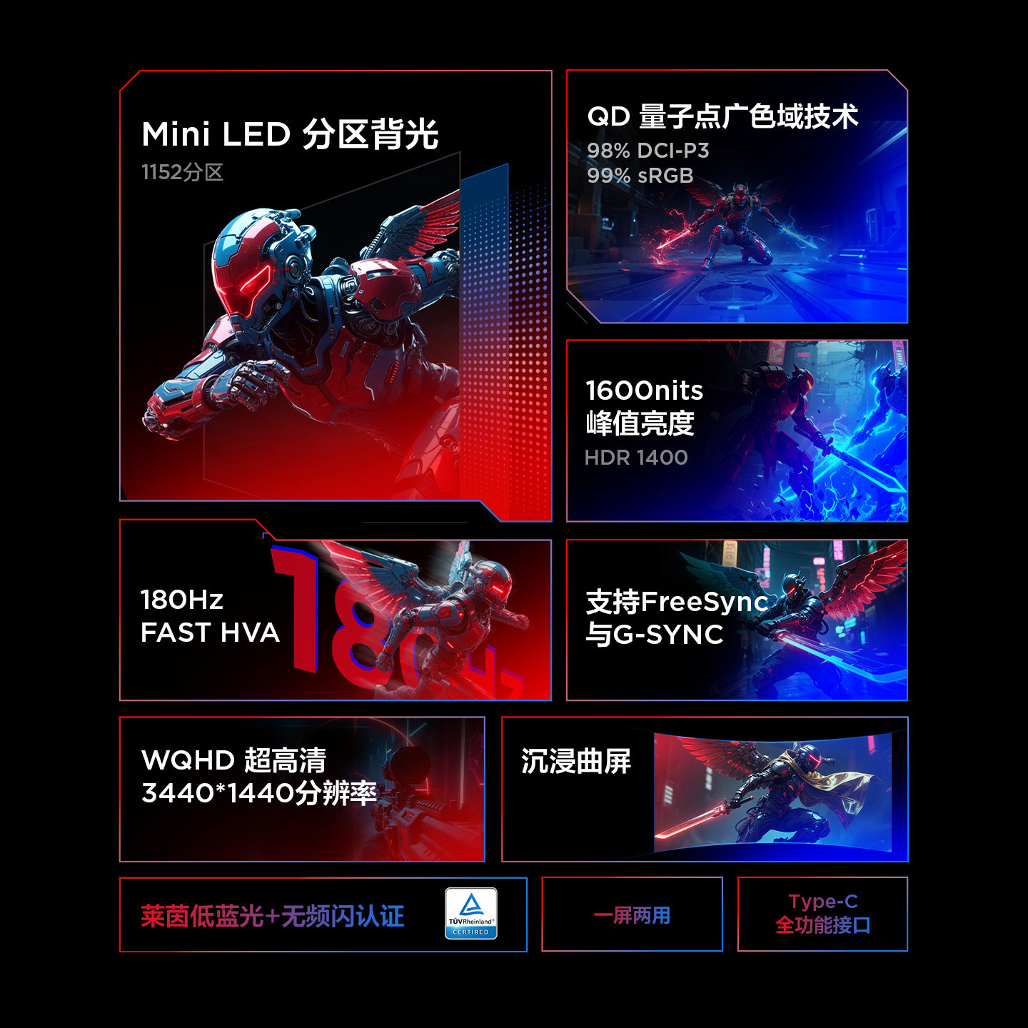 2304颗灯珠 180Hz 1ms Type-C90W曲面带鱼屏