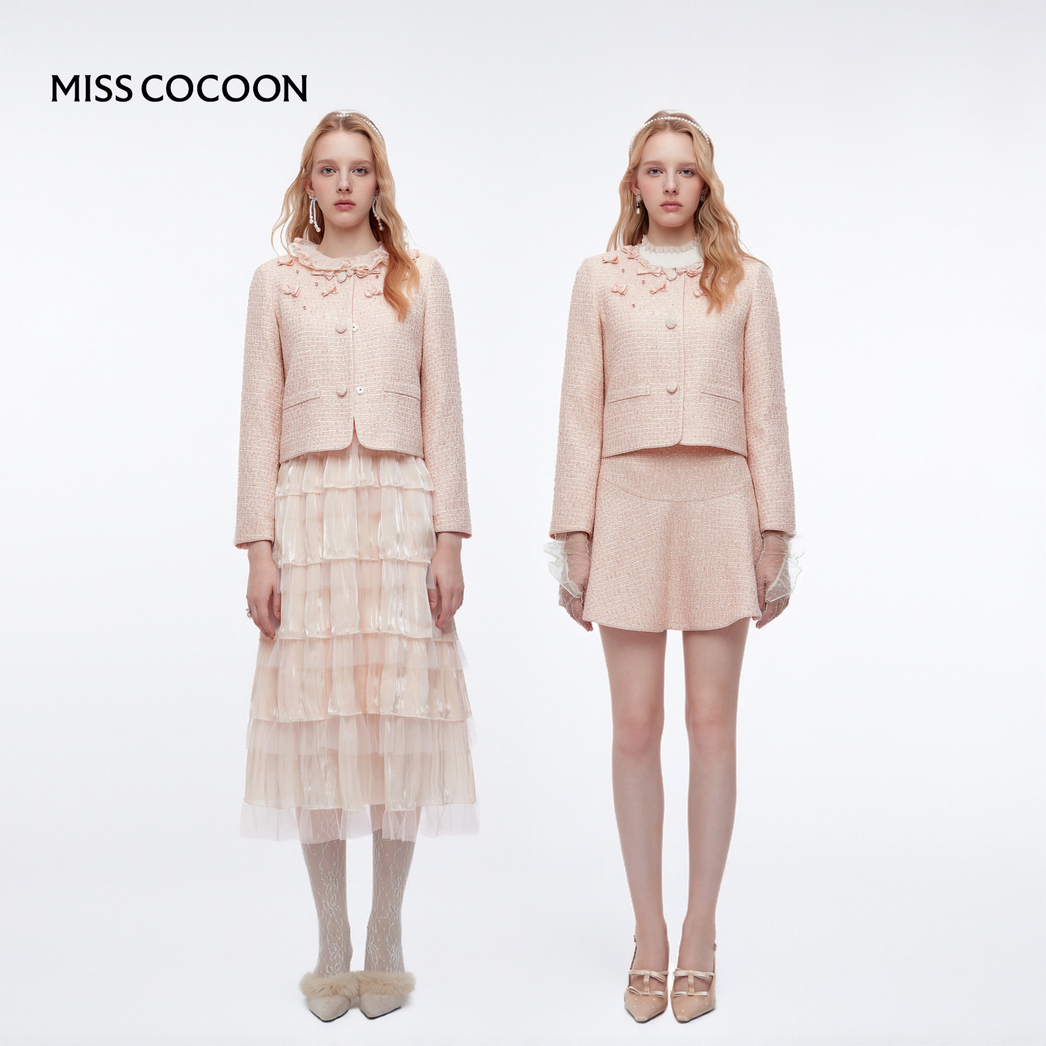 MISSCOCOON可可尼粉色套装裙女2025秋冬新款小香风粗花呢短外套