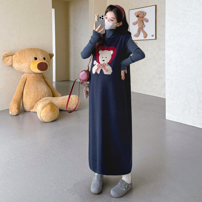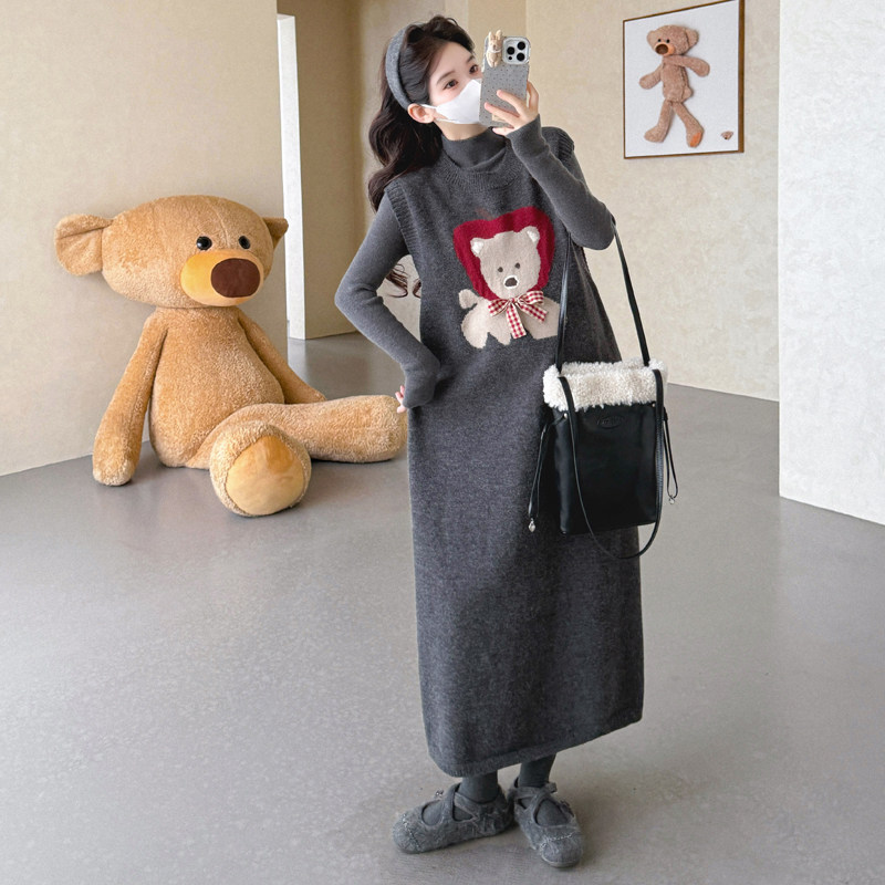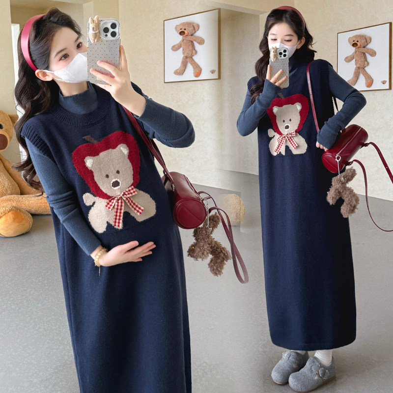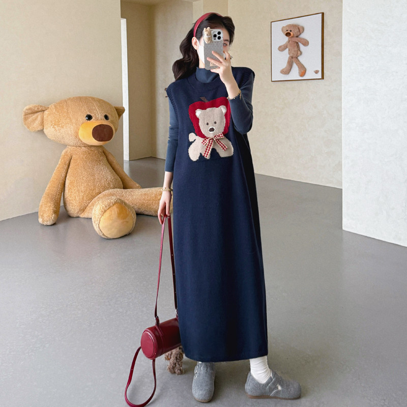 孕妇装连衣裙秋冬新款休闲风小熊卡通连衣长裙女长袖针织高级感