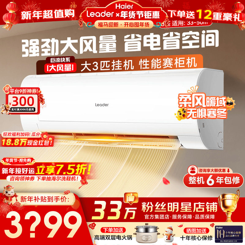 [国补15%】海尔空调大挂机统帅3匹2匹家用一级变频省电客厅旗舰店