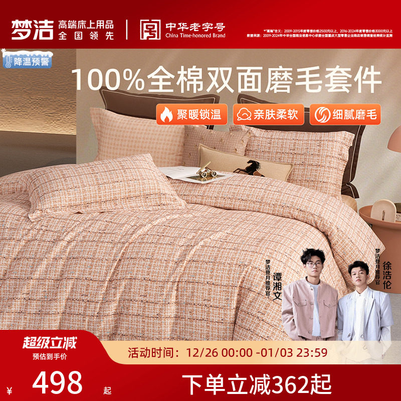 梦洁家纺双面磨毛四件套全棉纯棉100秋冬加厚被套床品2025新款