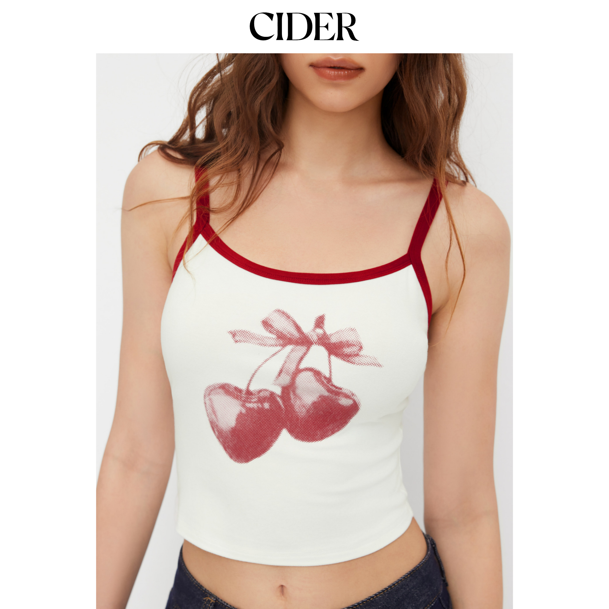 【明星同款】cider夏季樱桃印花撞色镶边短款吊带上衣114722795