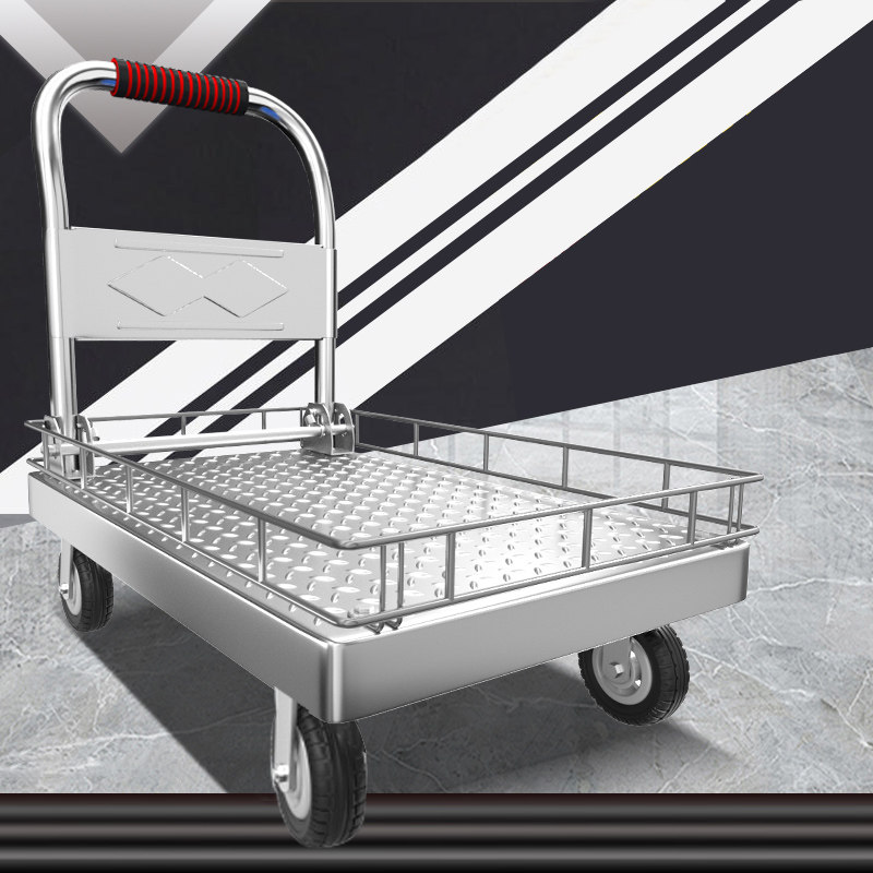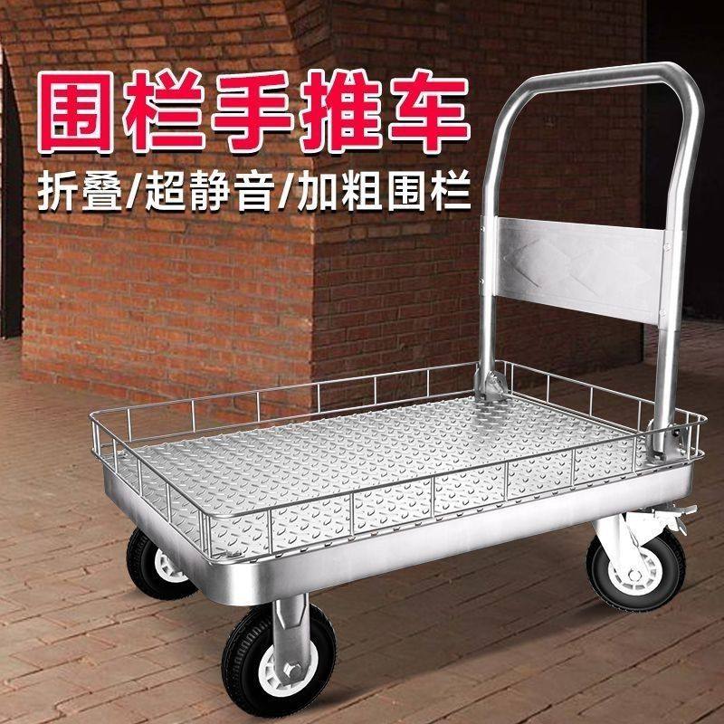 304不锈钢手推车平板车搬运车推货车静音折叠水产海鲜拉货车拖车