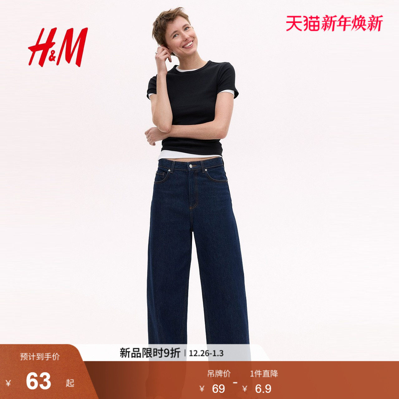 HM女装T恤2025冬季新款时尚修身短袖窄边领口直筒下摆上衣1260556
