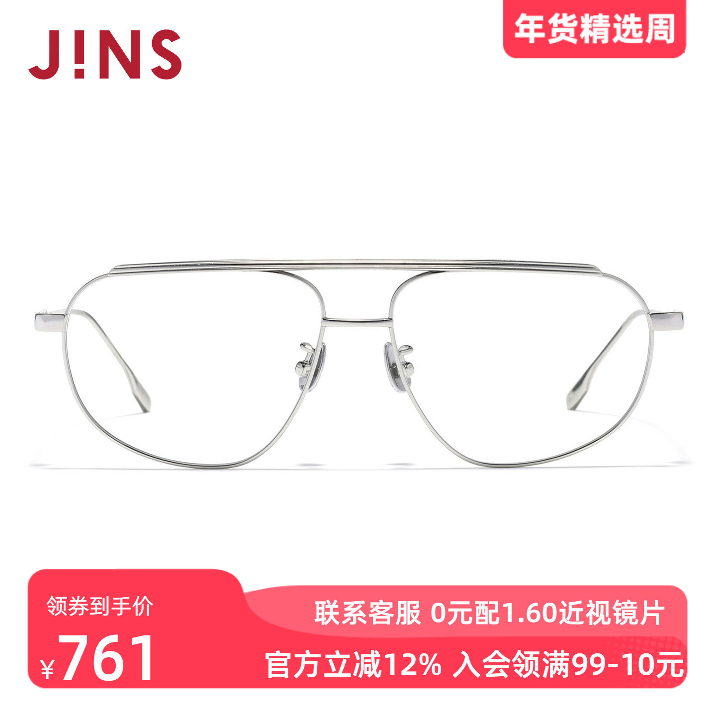 JINS睛姿近视眼镜钛金属异形飞行员框可加配防蓝光镜片UTF25A246