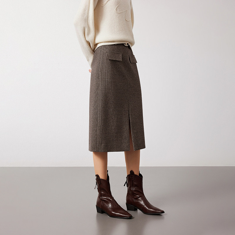 三福格子长裙女2025新款冬季气质流苏摆不规则半身裙子女装509092
