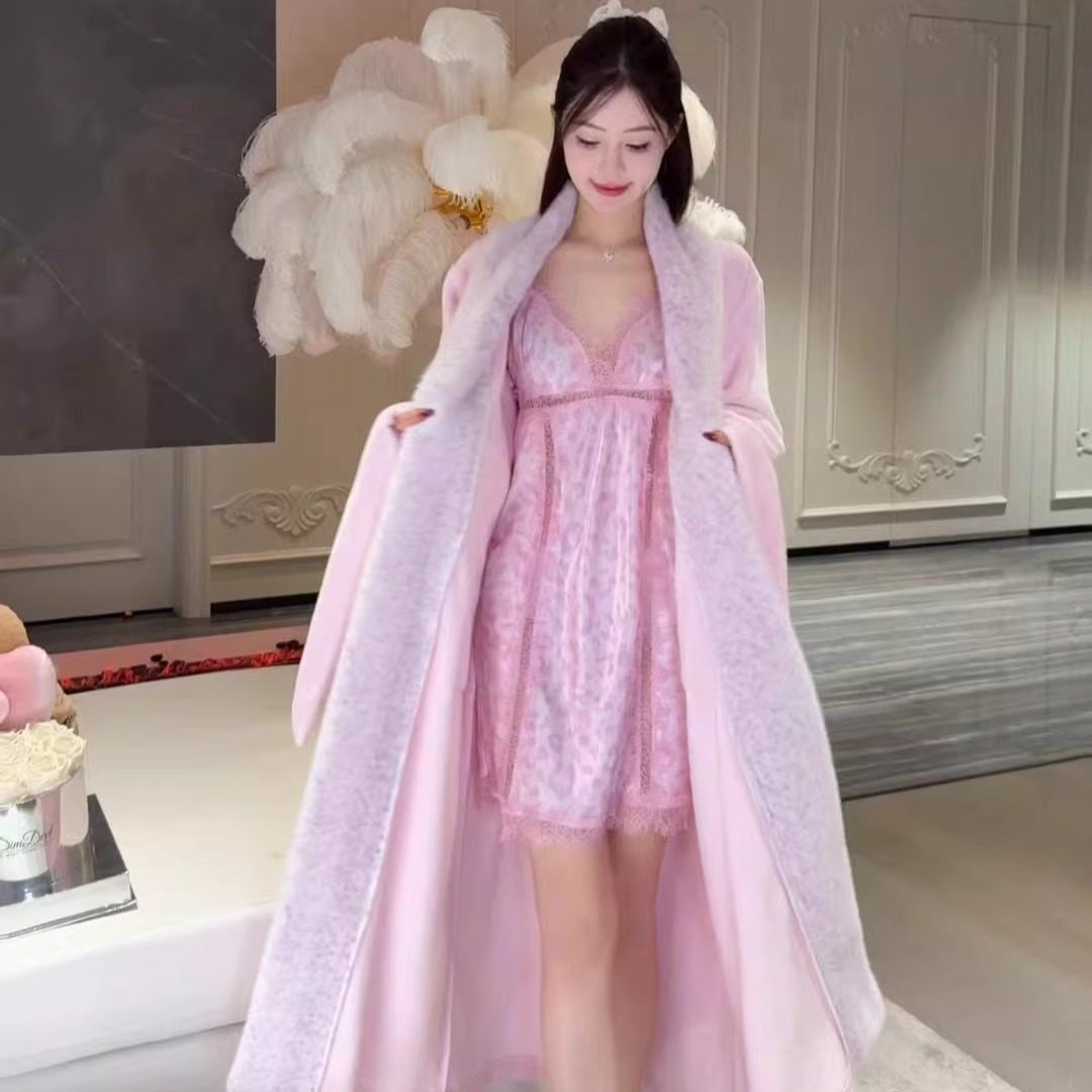 法式蕾丝睡袍女秋冬季珊瑚绒长款性感系带高级感浴袍睡裙公主睡衣