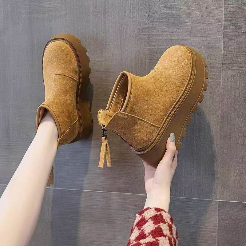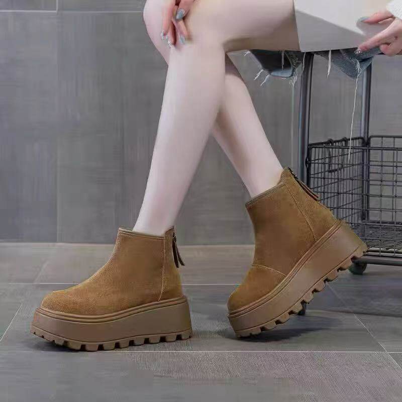 miu家厚底雪地靴女冬季真皮短靴羊毛侧拉链增高厚底加绒毛毛棉鞋