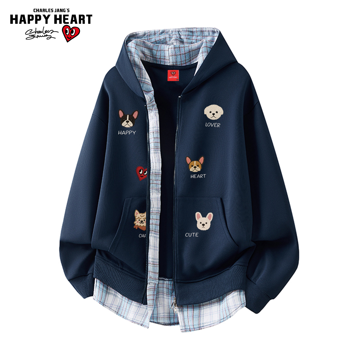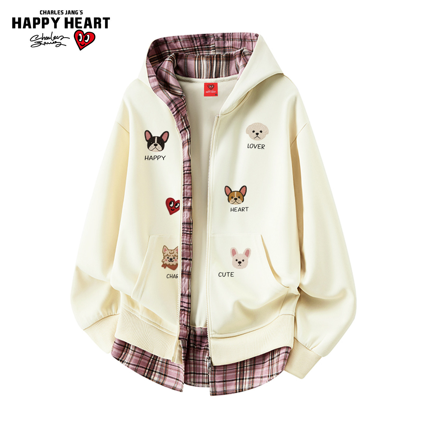 查尔斯桃心 小狗印花假两件连帽开衫卫衣男女春秋季休闲格子外套
